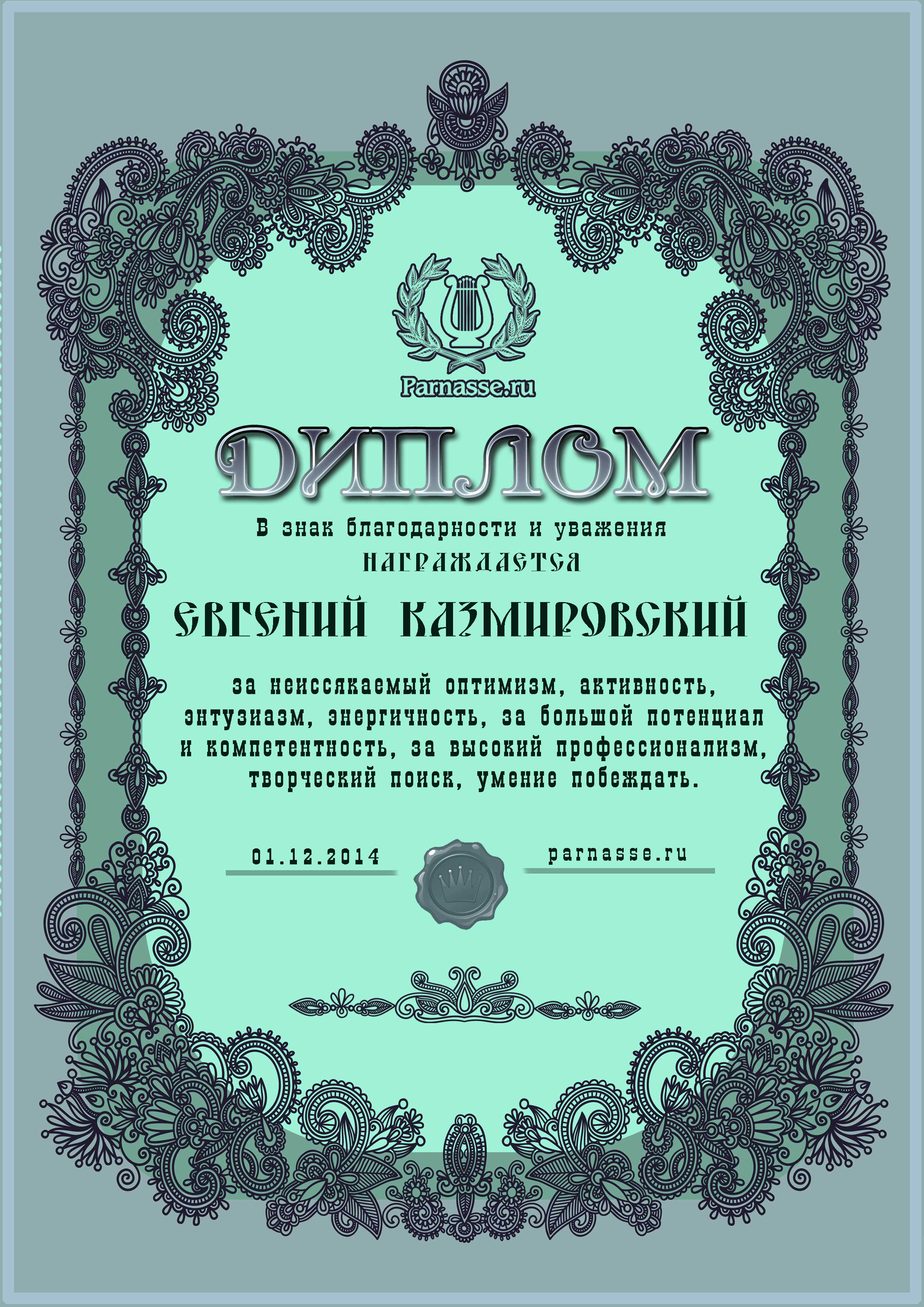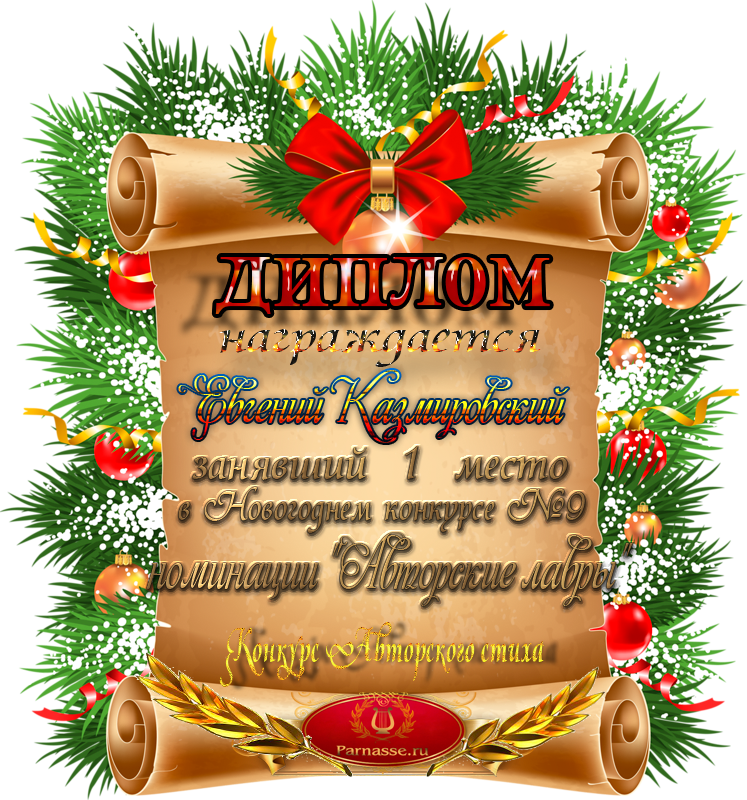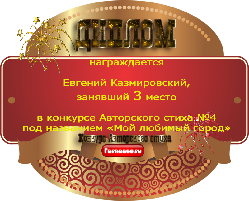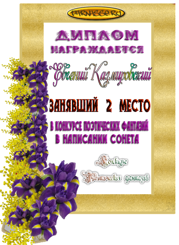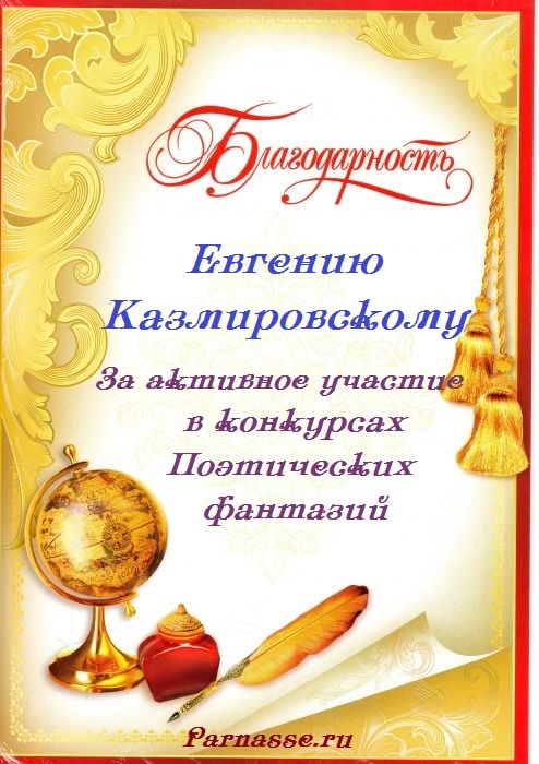 За неугасающую и неисчерпаемую творческую активность, постоянный контакт с Музой и признание сообществом "Парнасцев".От всей души желаем Вам, Евгений, здоровья, любви, успехов, благополучия, удачи и творческого вдохновения!