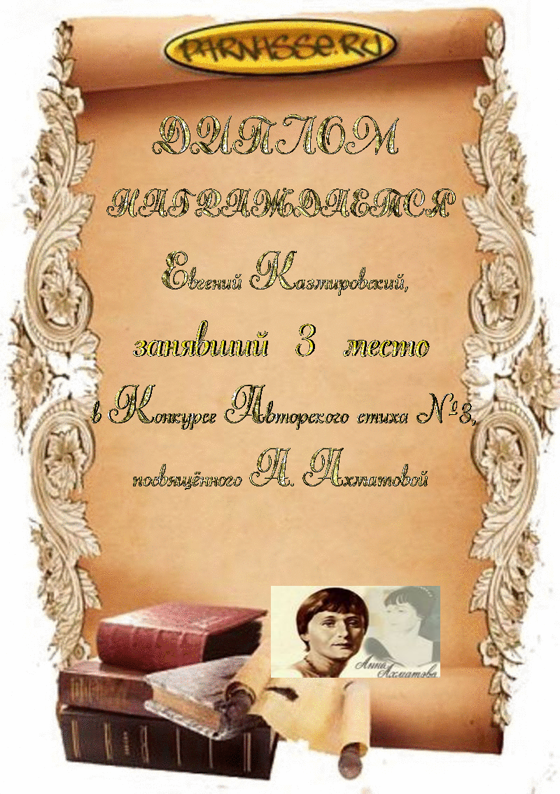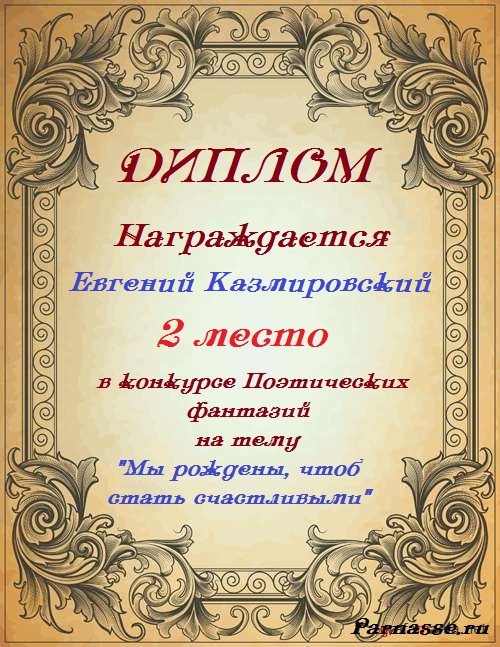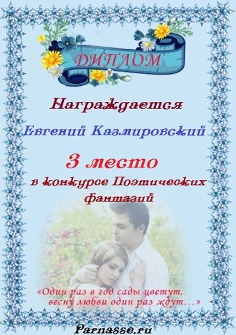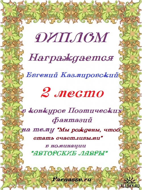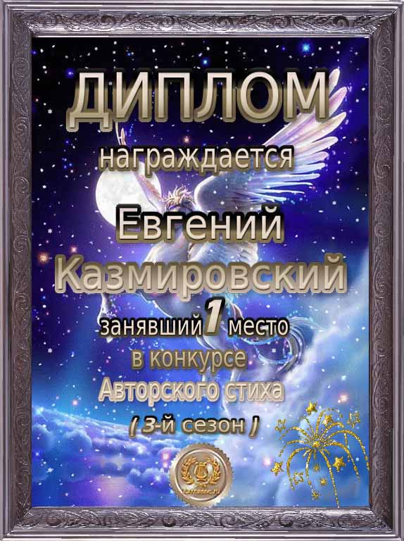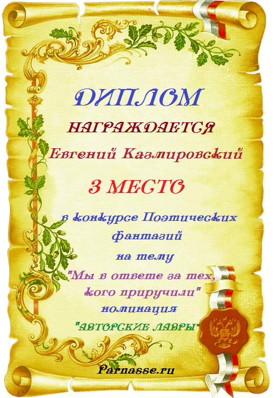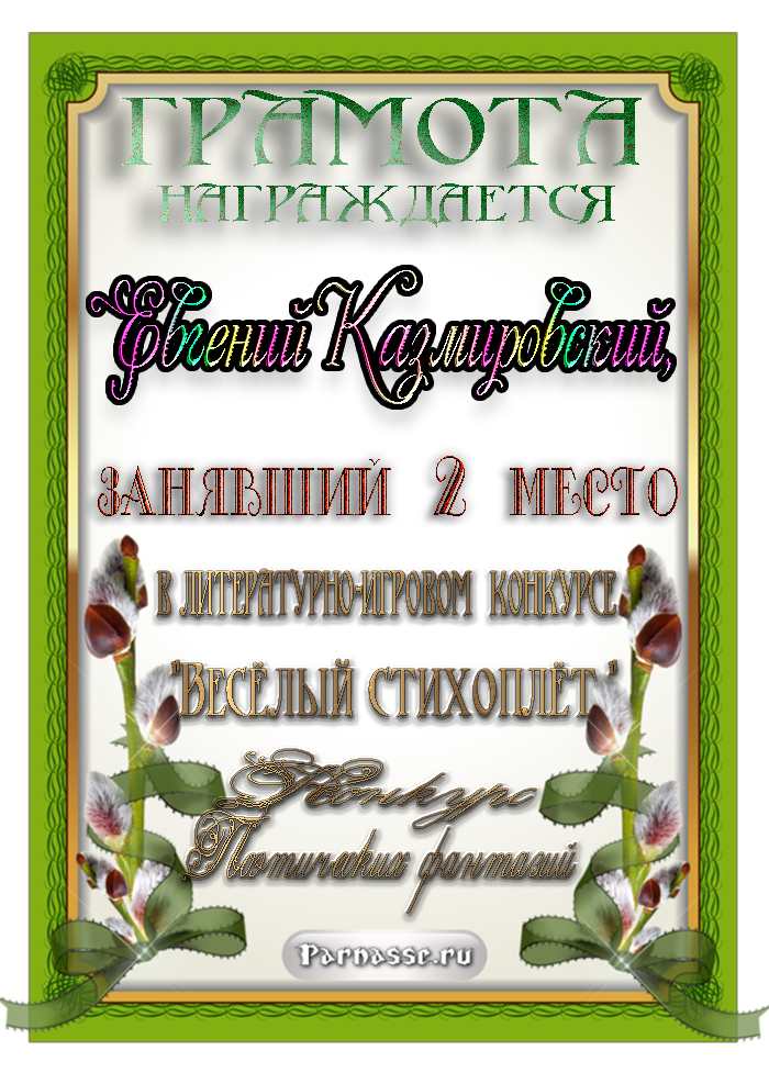 За неугасающую и неисчерпаемую творческую активность, постоянный контакт с Музой и признание сообществом "Парнасцев".От всей души желаем Вам, Евгений, здоровья, любви, успехов, благополучия, удачи и творческого вдохновения!