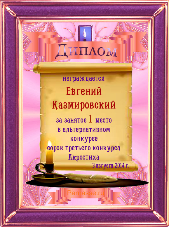 Диплом за 1 место во 2 годовом конкурсе Акростиха по итогам судейского голосования (Альтернатива)! ПОЗДРАВЛЯЮ!