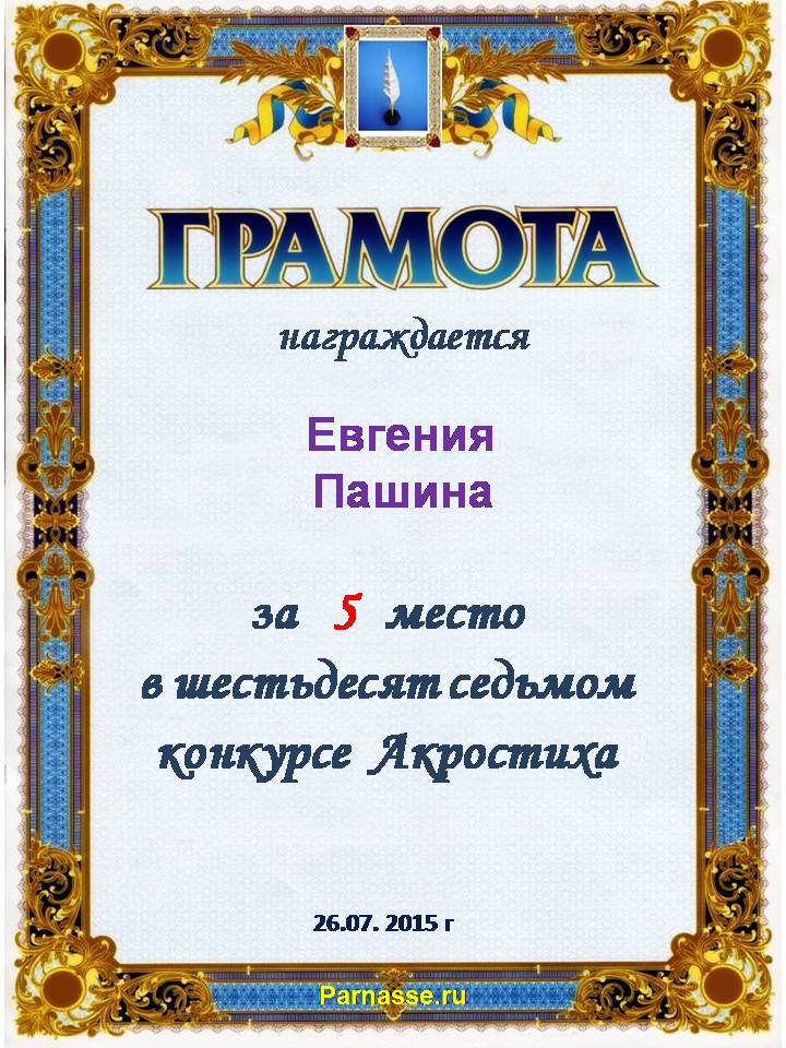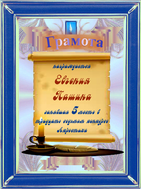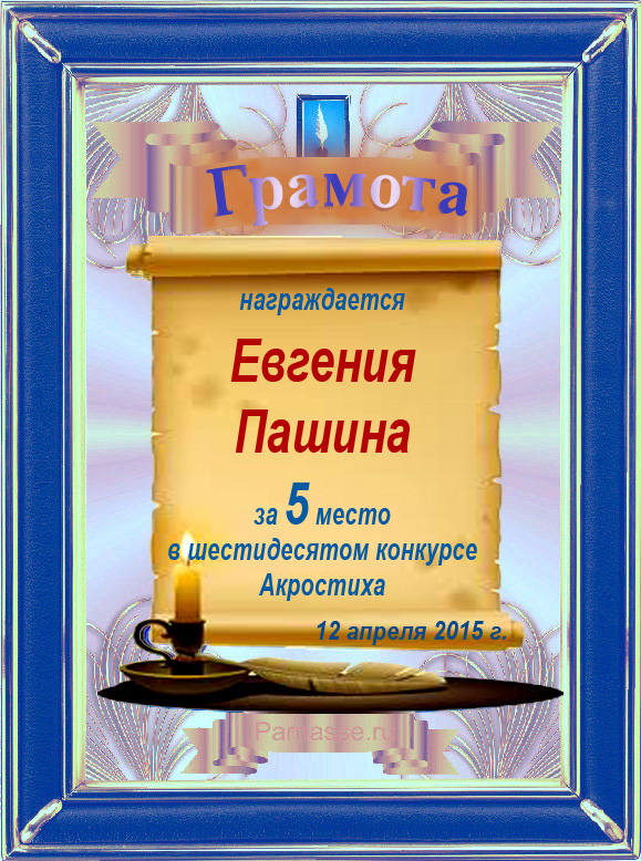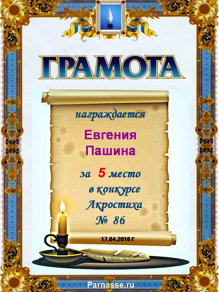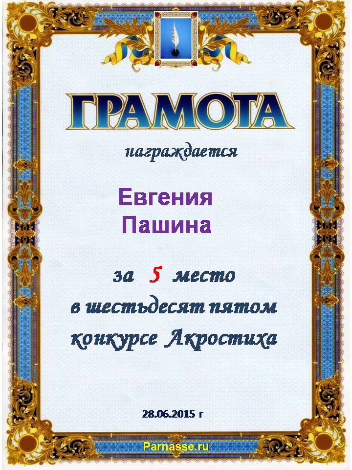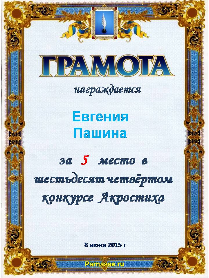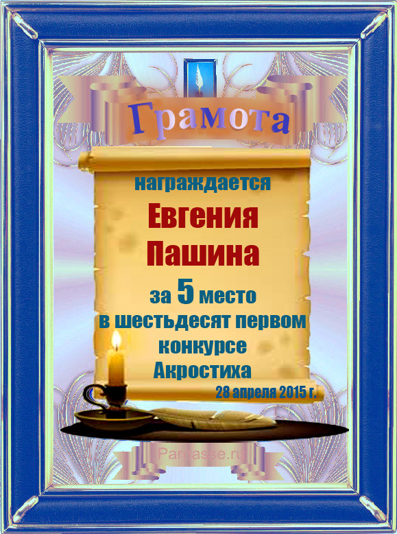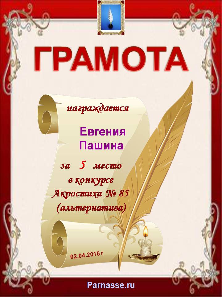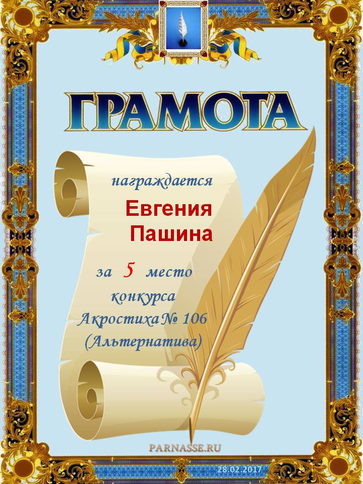 Грамота за 5 место в 106 конкурсе АКРОСТИХА (Альтернатива)! ПОЗДРАВЛЯЮ!