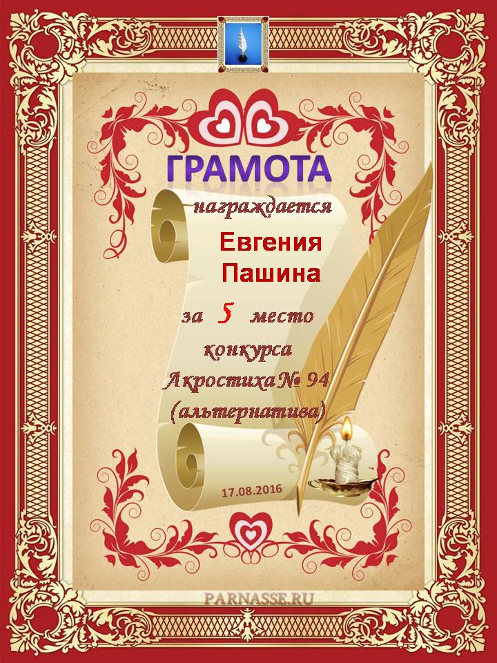 Грамота за 5 место в 94 конкурсе Акростиха. (Альтернатива)ПОЗДРАВЛЯЮ!