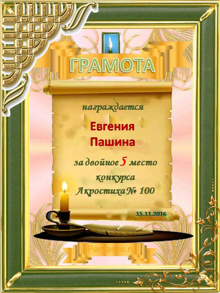 Грамота за двойное 5 место в юбилейном конкурсе АКРОСТИХА № 100! ПОЗДРАВЛЯЮ!