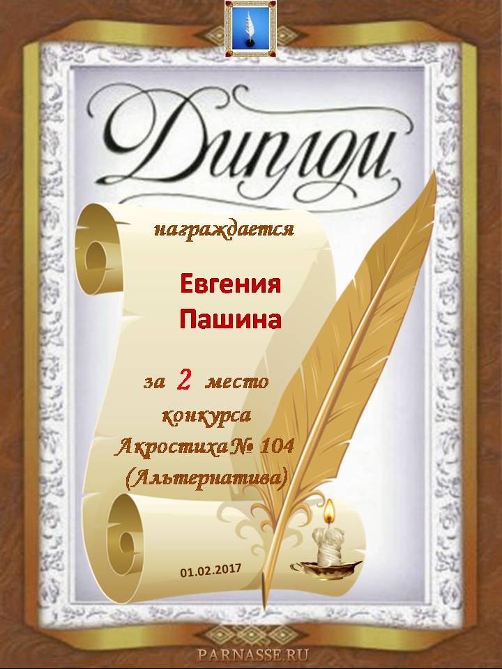Диплом за 2 место в 104 конкурсе АКРОСТИХА (Альтернатива)! ПОЗДРАВЛЯЮ!