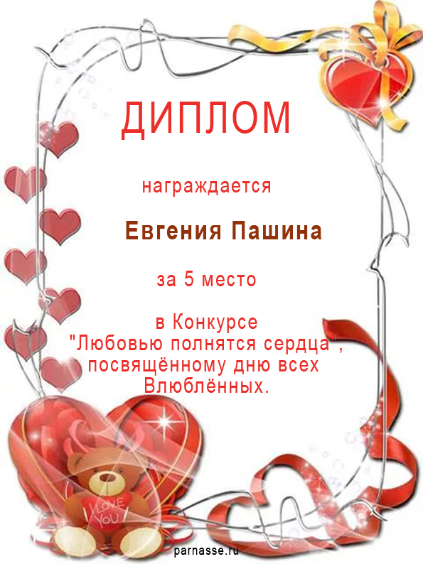 Поздравляю! 5 место в Конкурсе "Любовью полнятся сердца", посвящённому дню всех влюблённых!