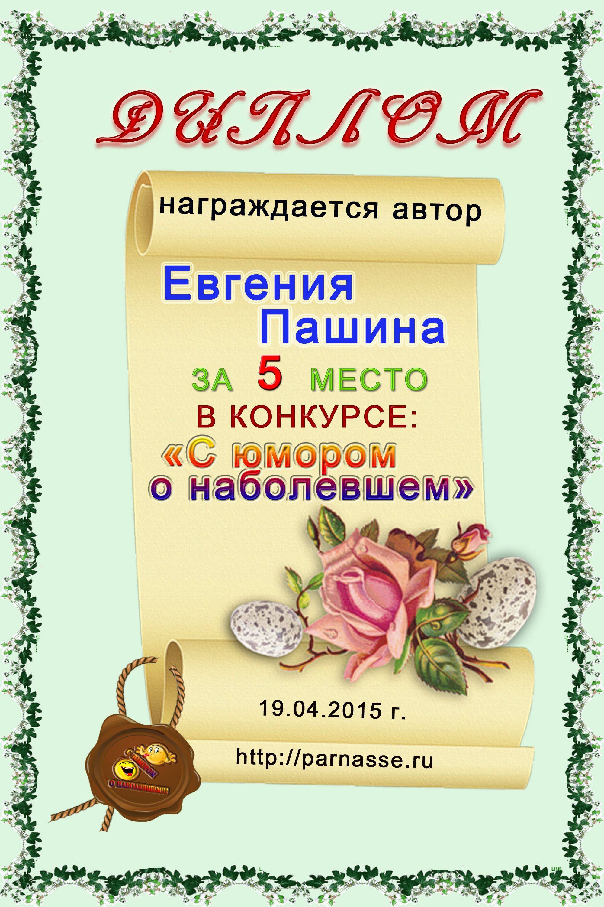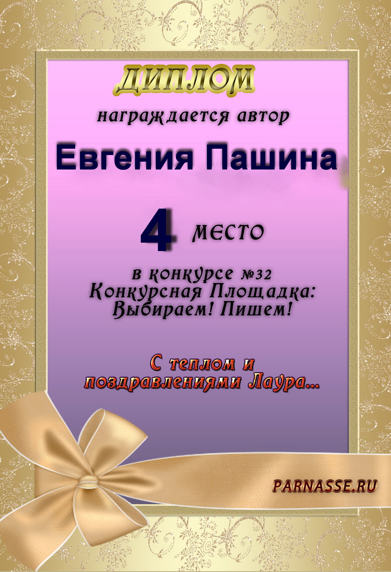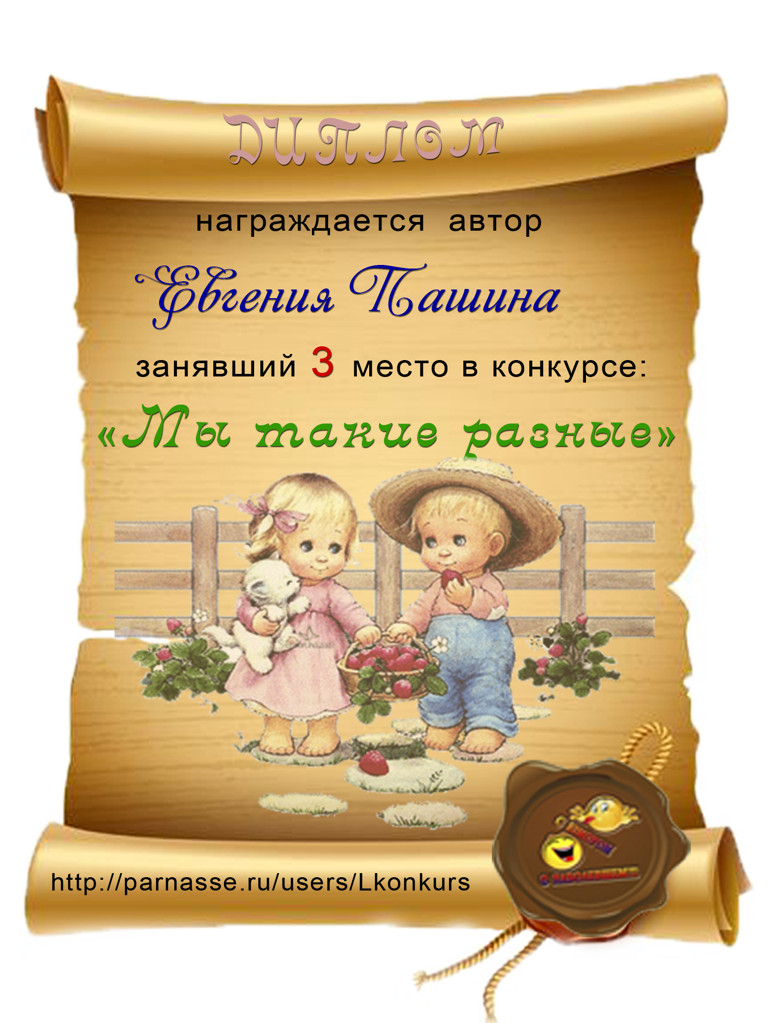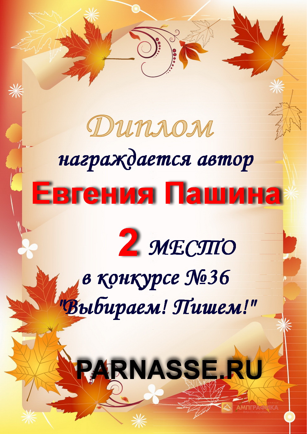 Диплом за 1 место в праздничном конкурсе "Поздравим Парнас с трёхлетием вместе!"