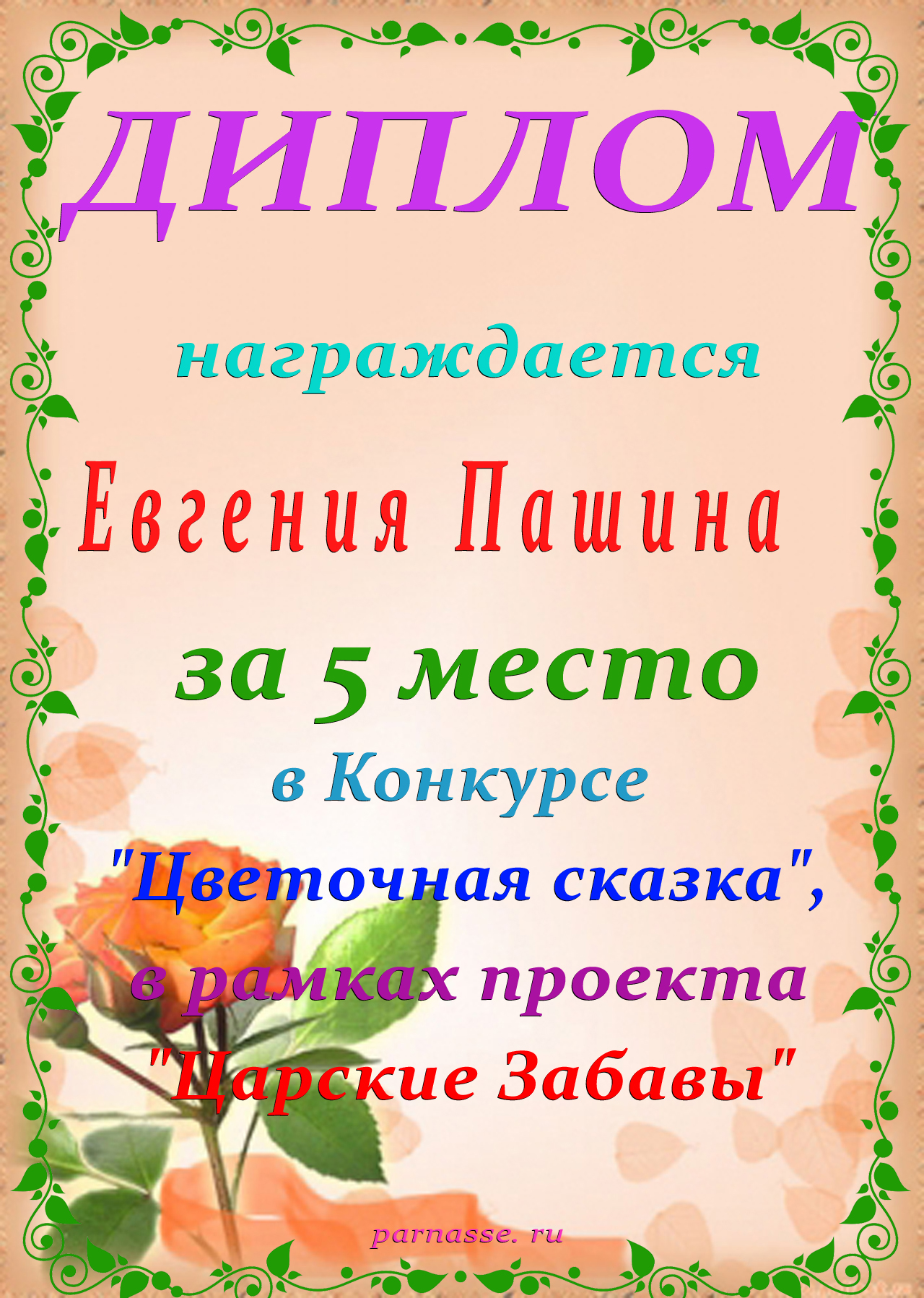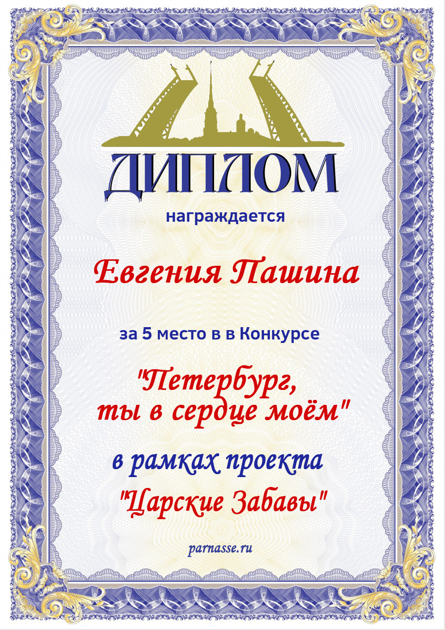 За 5 место в Конкурсе "Петербург, ты в сердце моём!" в рамках проекта "Царские Забавы"