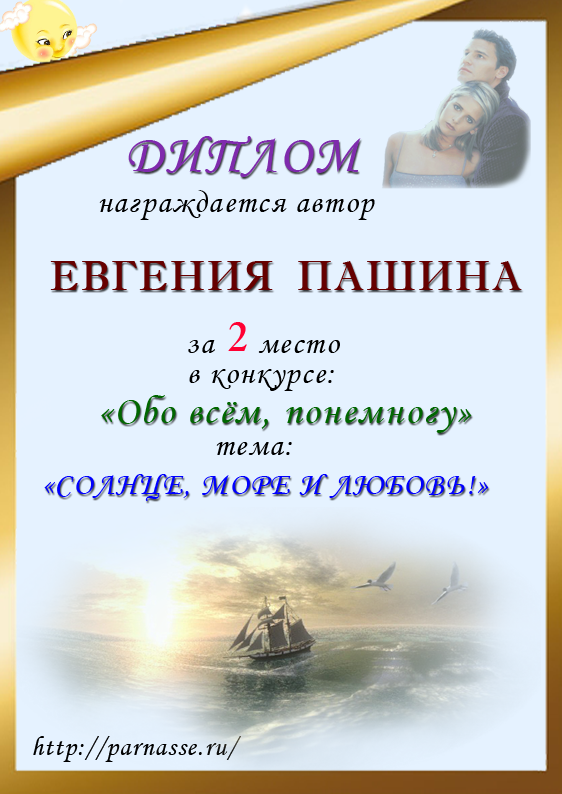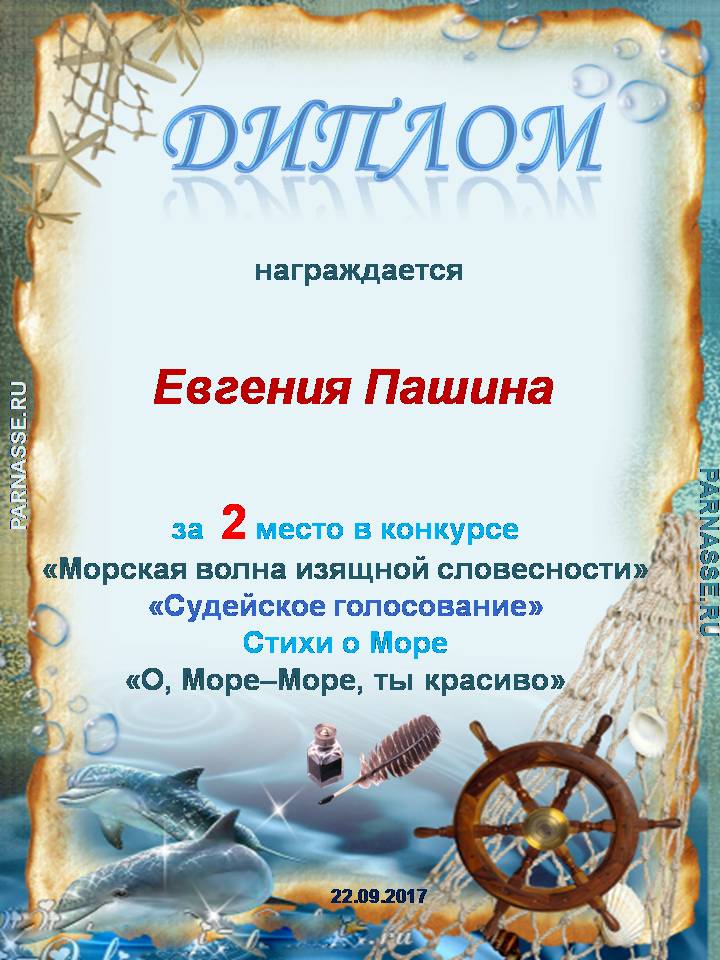 Евгения, поздравляем с занятым 2 местом в номинации Стихи о море "О, море-море, ты красиво!" - судейское голосование! Желаем новых творческих побед!
