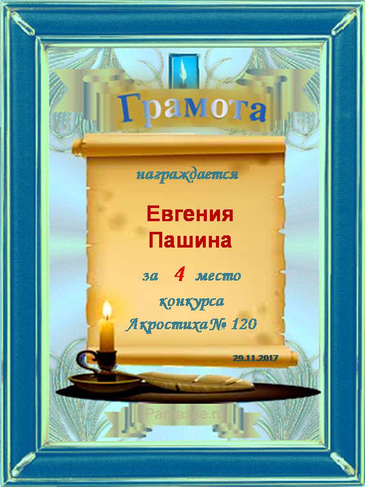 Грамота за 4 место в 120 конкурсе АКРОСТИХА (Альтернатива)! ПОЗДРАВЛЯЮ!