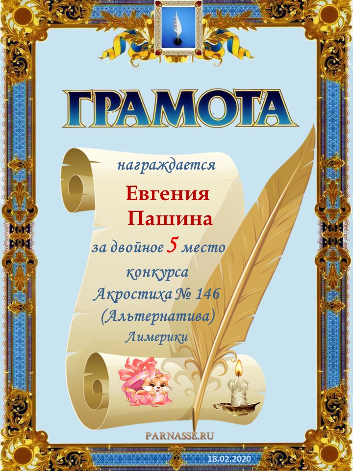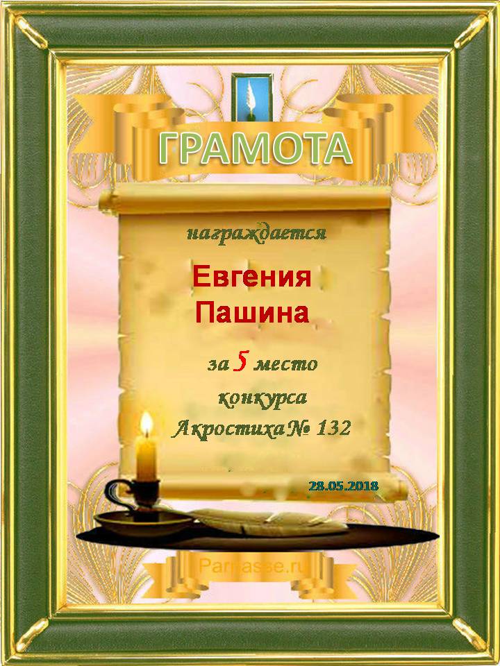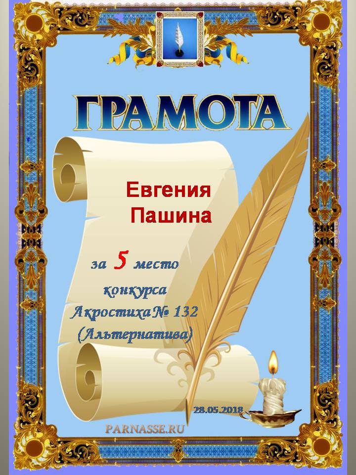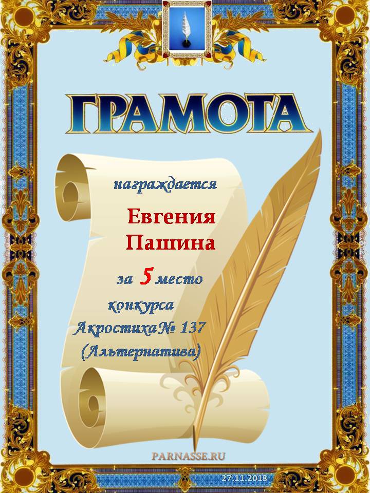 Грамота за 5 место в 118 конкурсе АКРОСТИХА (Альтернатива)! ПОЗДРАВЛЯЮ!