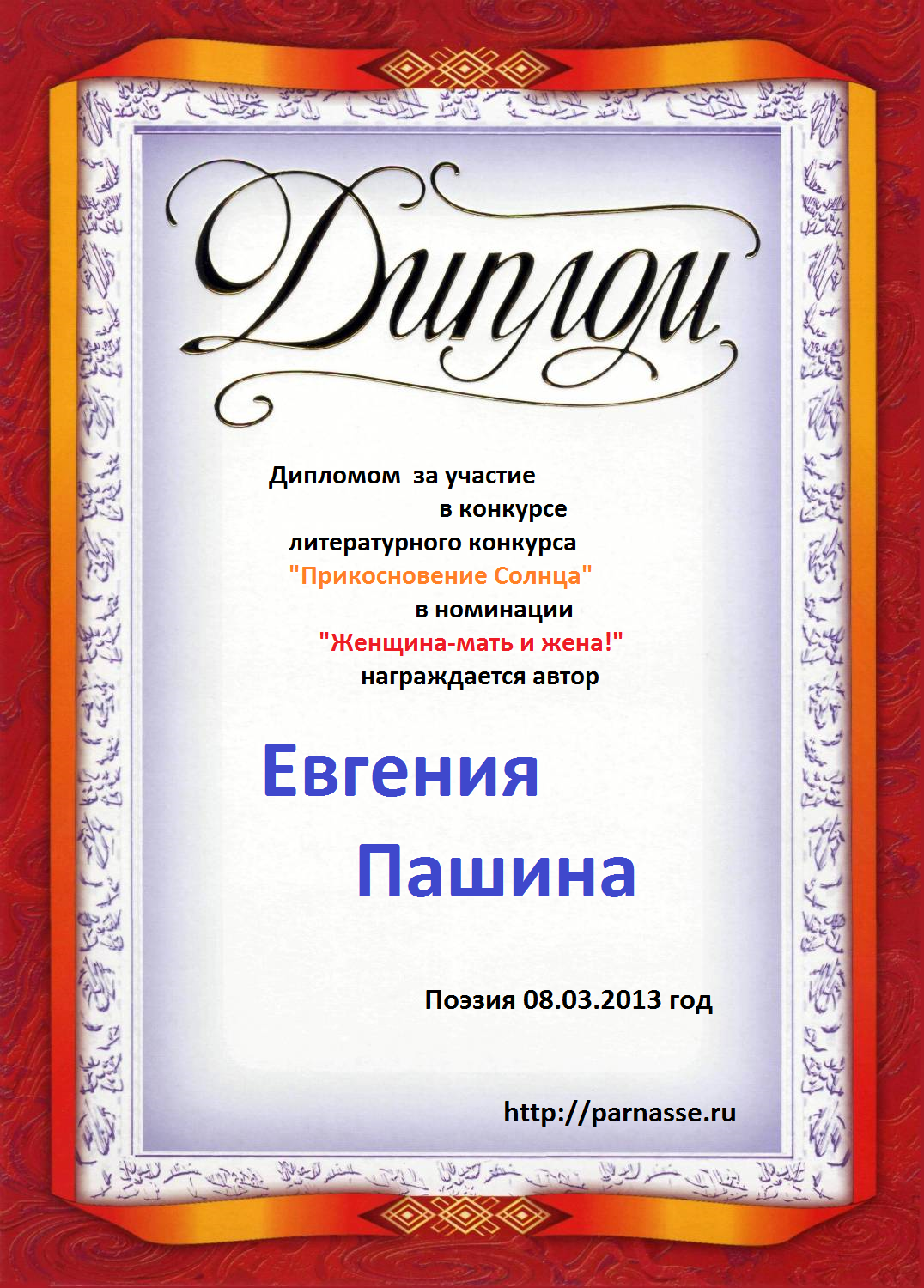 Диплом в конкурсе поэзии "Прикосновение Солнца"