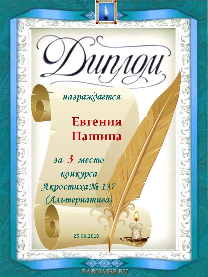 Диплом за 3 место в 116 конкурсе АКРОСТИХА (Альтернатива)! ПОЗДРАВЛЯЮ!
