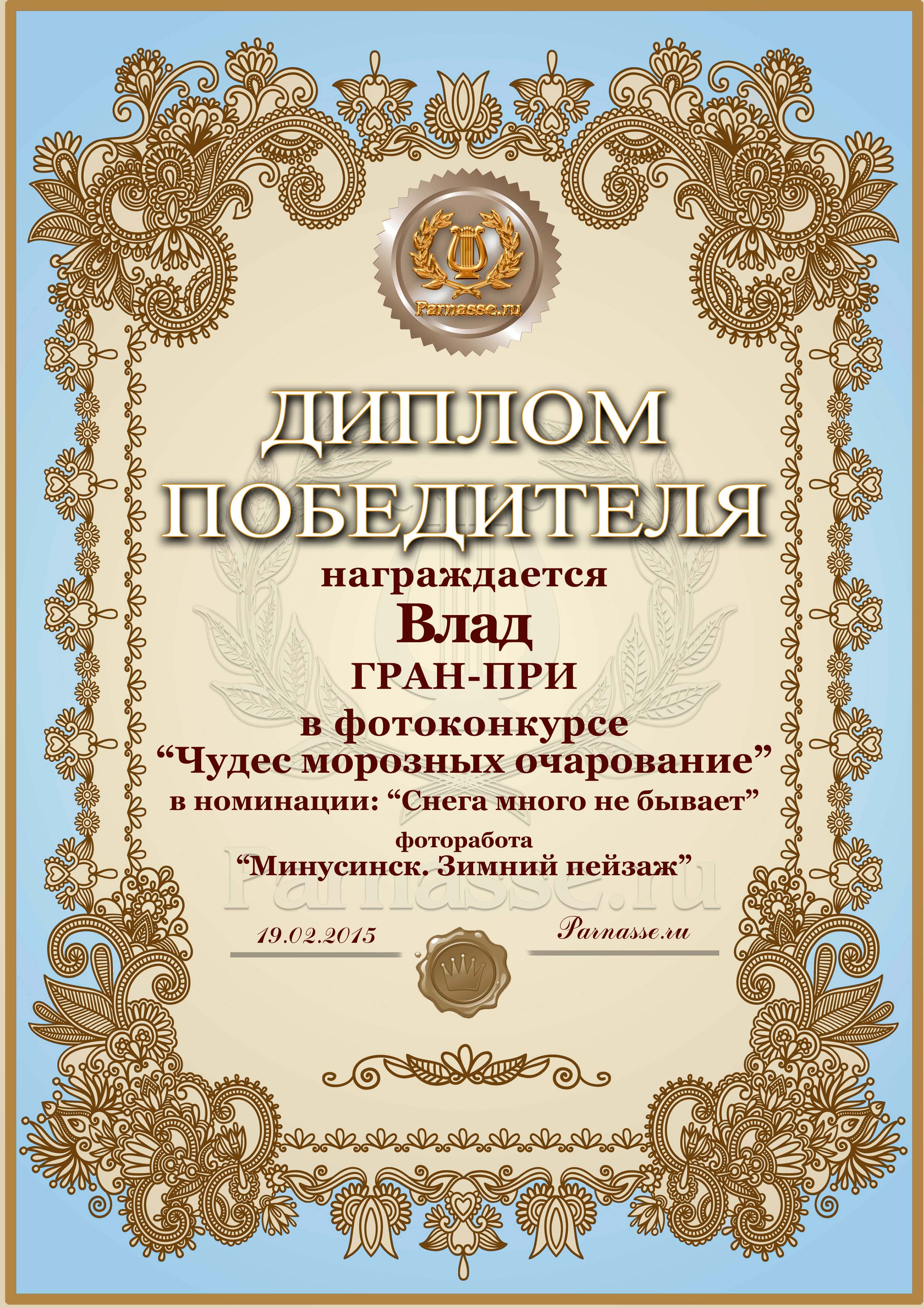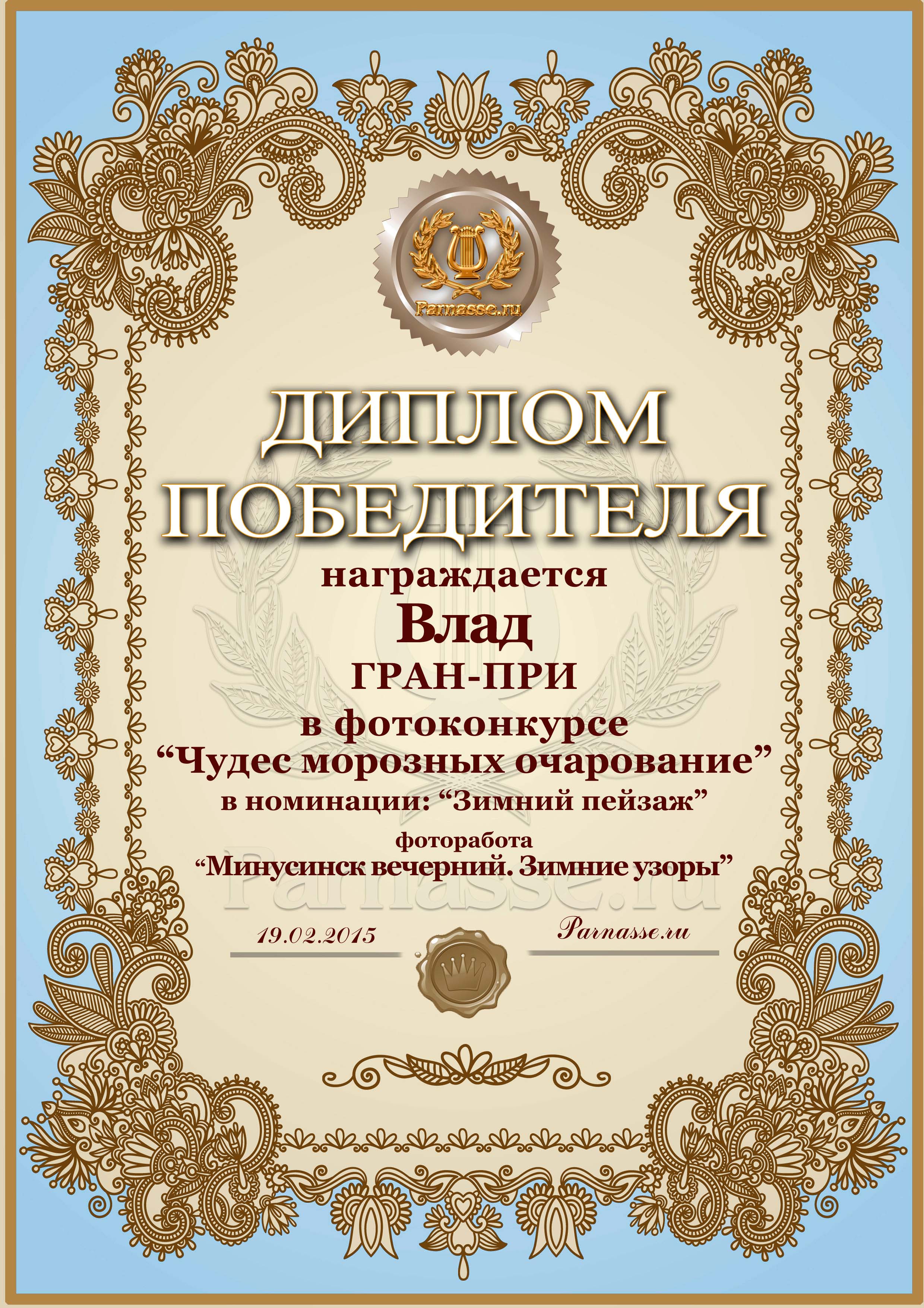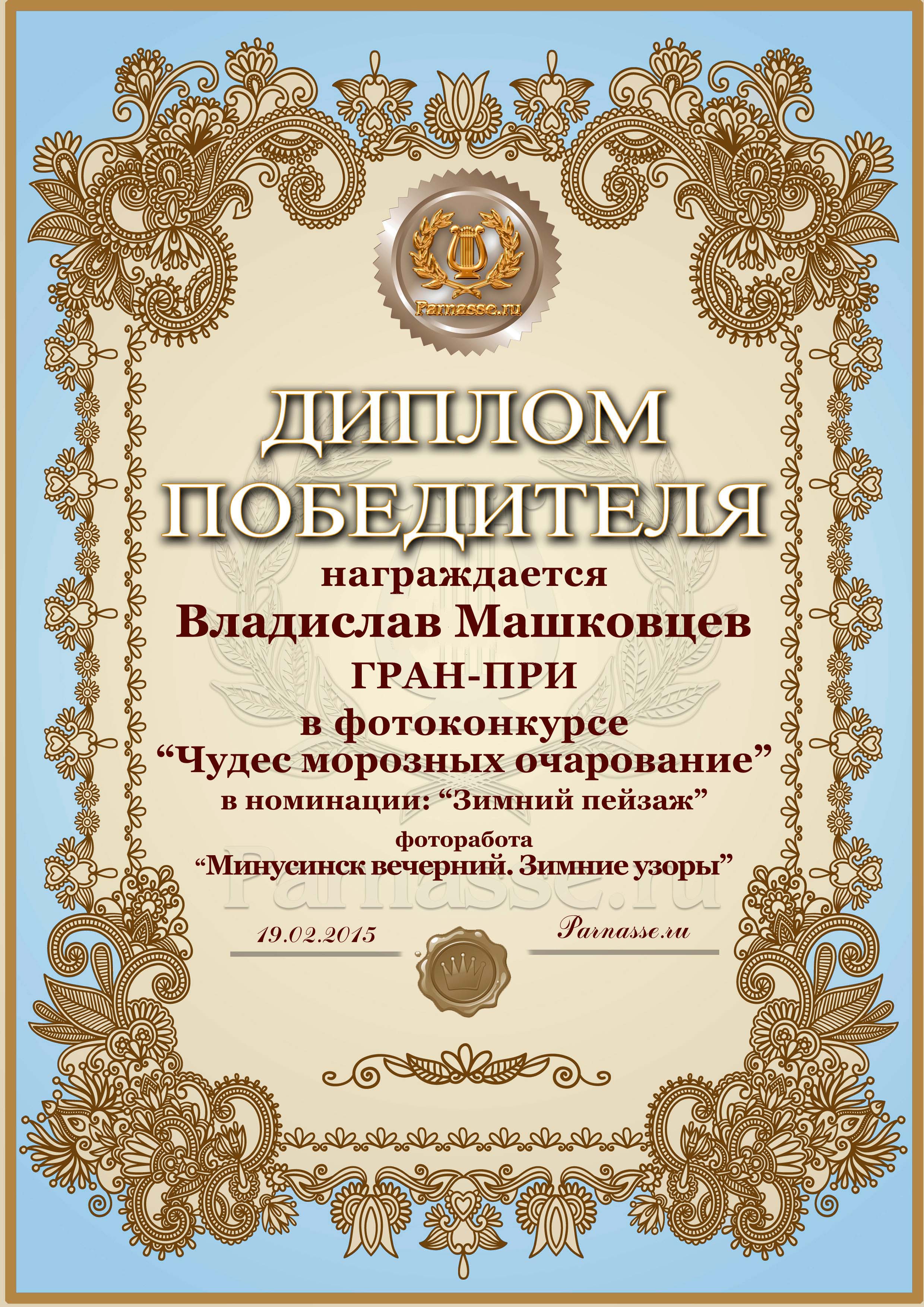 Диплом за ГРАН-ПРИ в фотоконкурсе "Чудес морозных очарование"