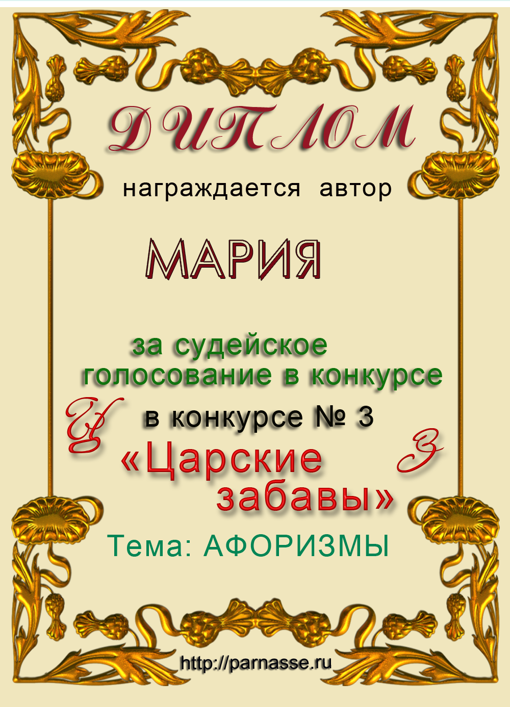 Диплом за судейское голосование в конкурсе ЦАРСКИЕ ЗАБАВЫ № 3