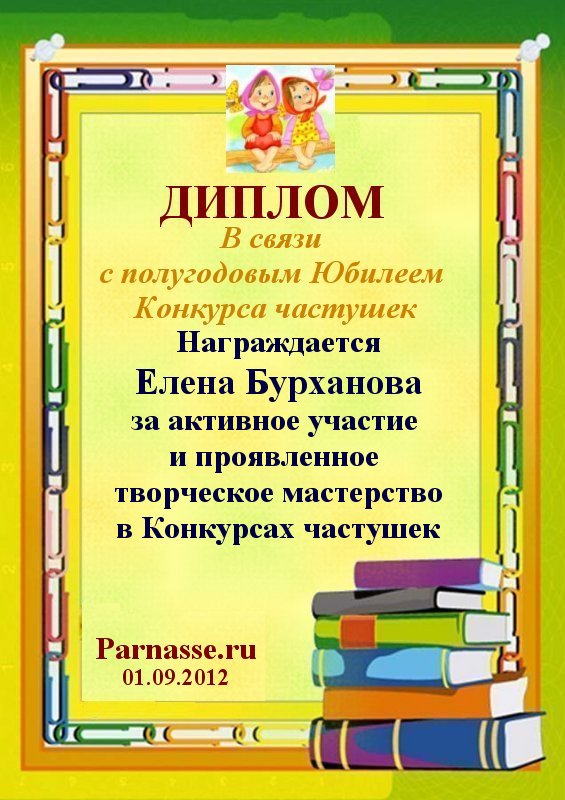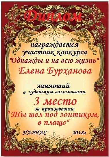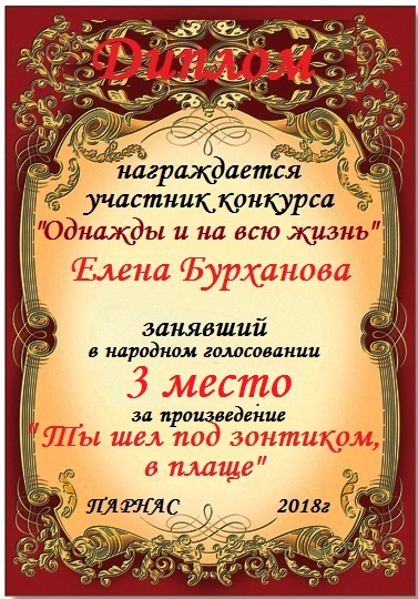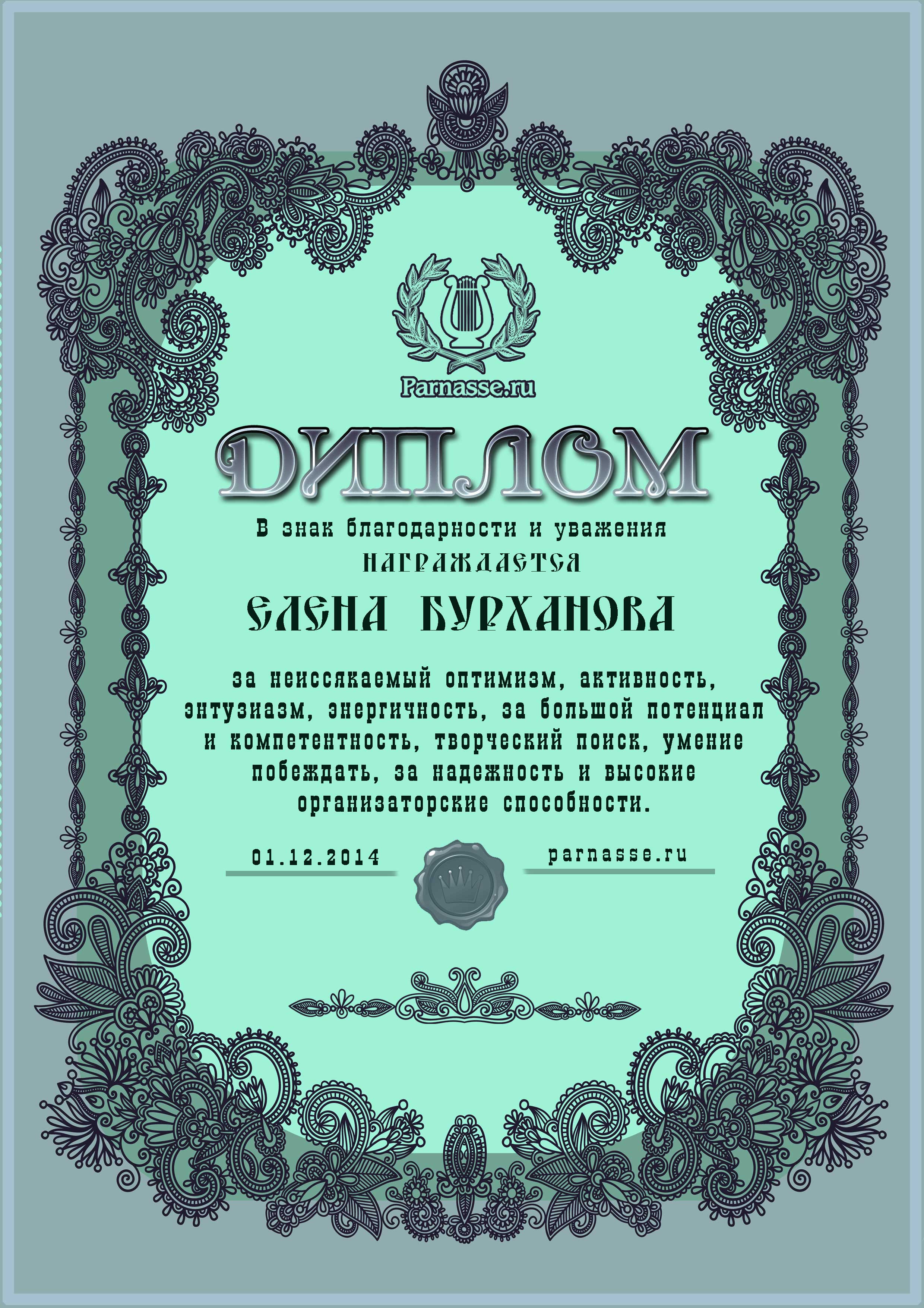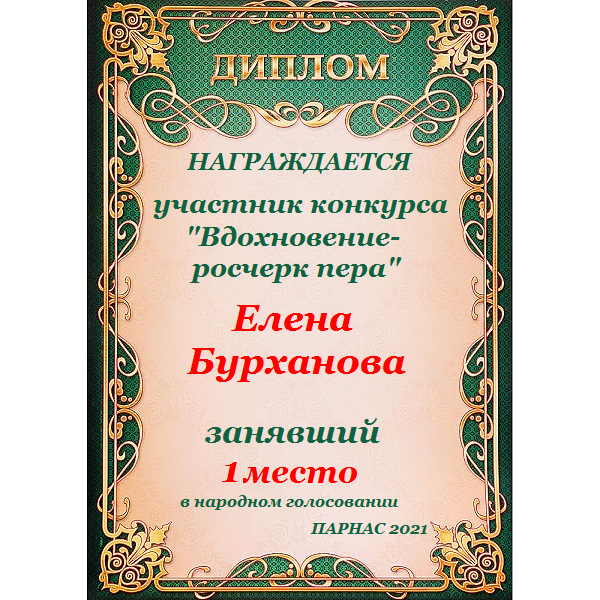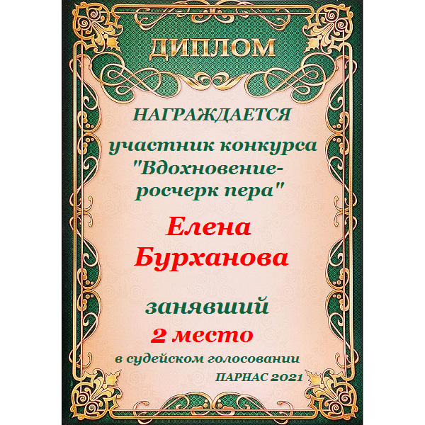 За неугасающую и неисчерпаемую творческую активность, постоянный контакт с Музой и признание сообществом "Парнасцев".От всей души желаем Вам, Елена, здоровья, любви, успехов, благополучия, удачи и творческого вдохновения!
