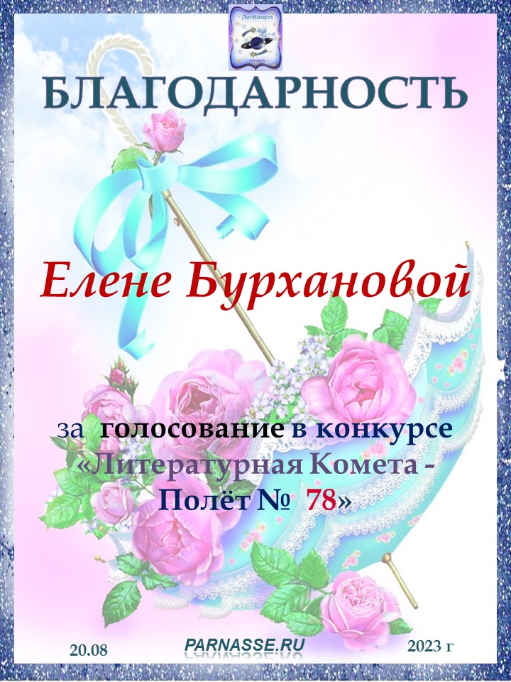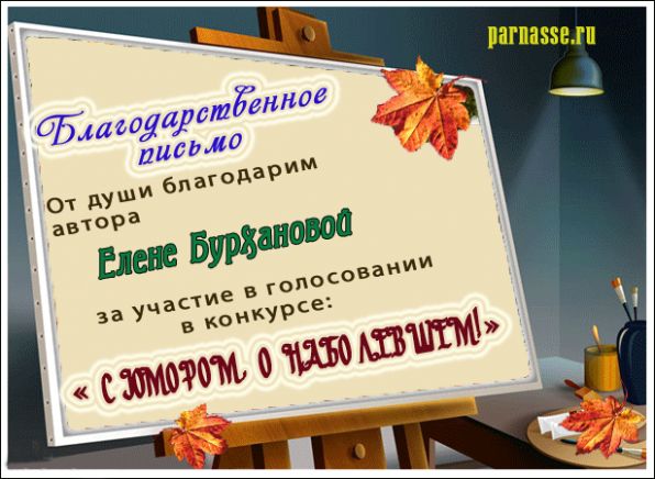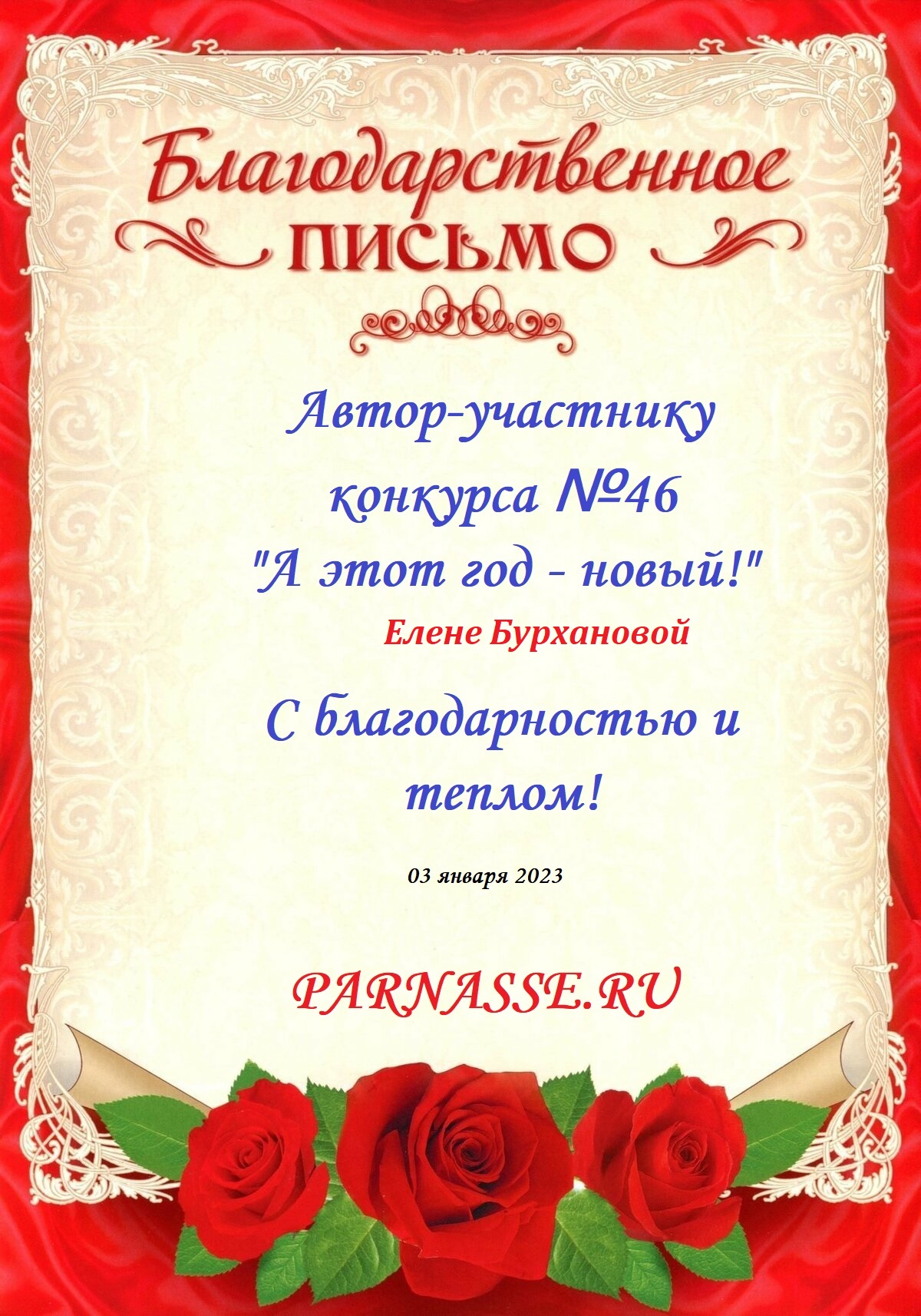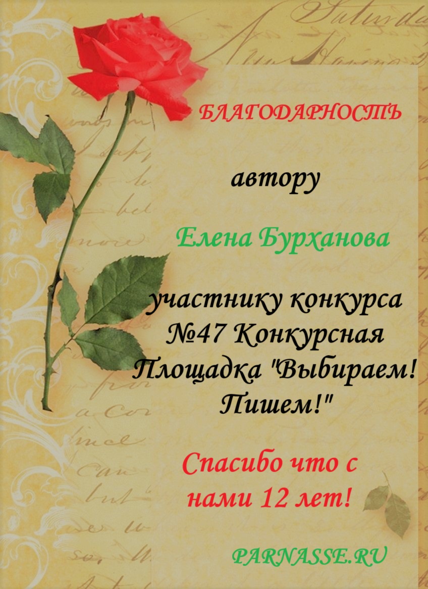 Номинация "Лучшее поздравление Парнасу в прозе".Искренне и от всего сердца благодарим Вас, ЕЛЕНА, за участие в юбилейном конкурсе, за Ваши прекрасные, ярчайшие слова благодарности нашему порталу! Мы желаем Вам крепкого здоровья, жизнелюбия, творческой Музы и исполнения самых заветных желаний, которые только у Вас есть!