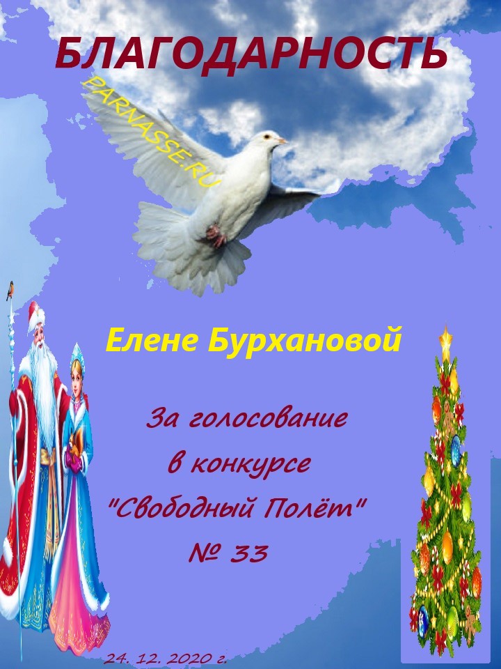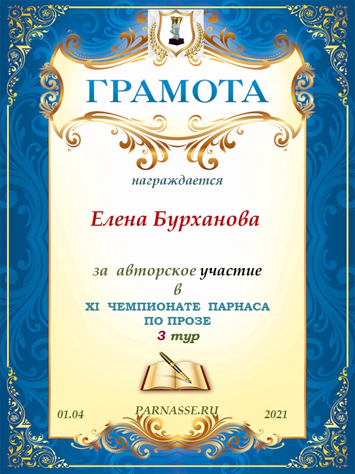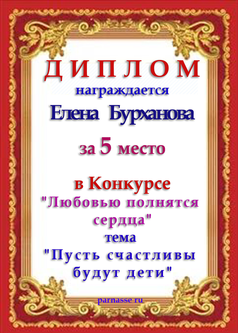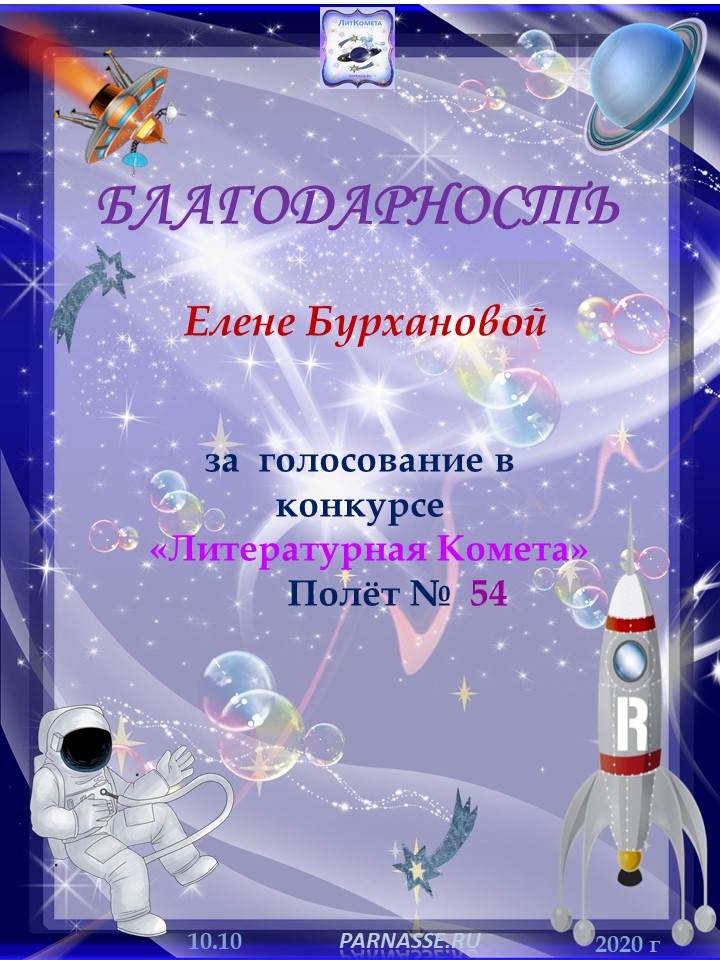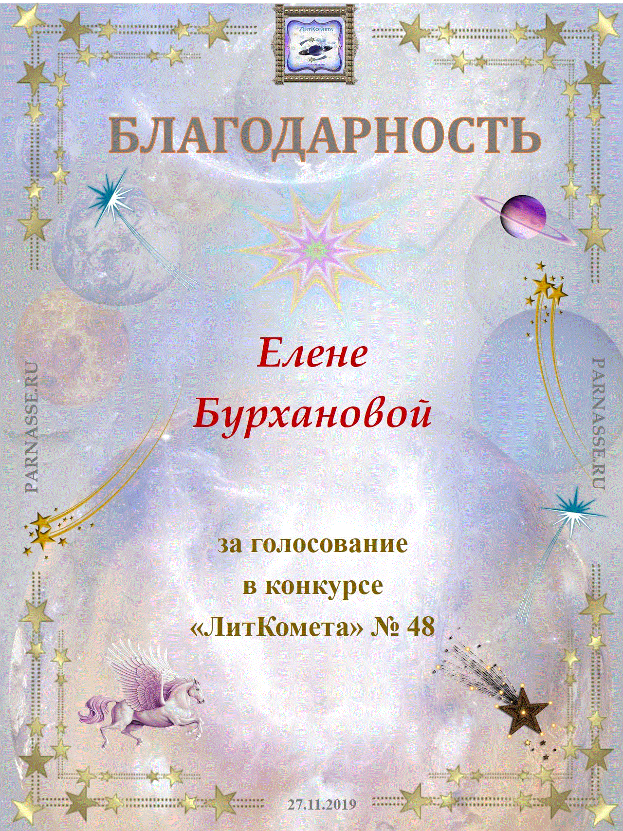 Номинация "Лучшее поздравление Парнасу в прозе".Искренне и от всего сердца благодарим Вас, ЕЛЕНА, за участие в юбилейном конкурсе, за Ваши прекрасные, ярчайшие слова благодарности нашему порталу! Мы желаем Вам крепкого здоровья, жизнелюбия, творческой Музы и исполнения самых заветных желаний, которые только у Вас есть!