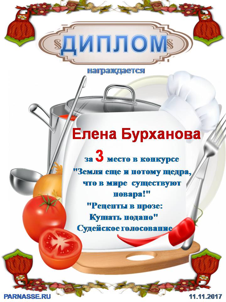 Поздравляем с 3 местом! Номинация: "Рецепты в прозе:кушать подано!" - судейское голосование.