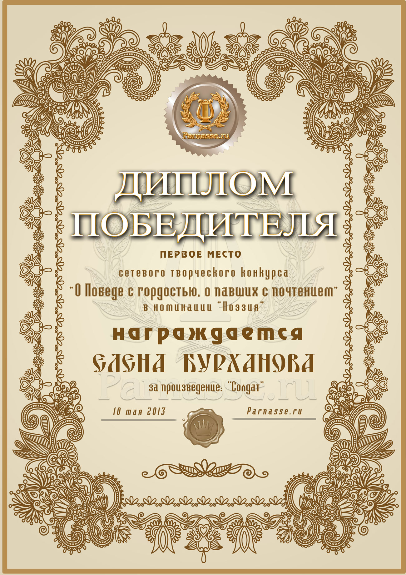 Диплом Победителя за 1 место в праздничном конкурсе "Поздравим Парнас с трёхлетием вместе!"