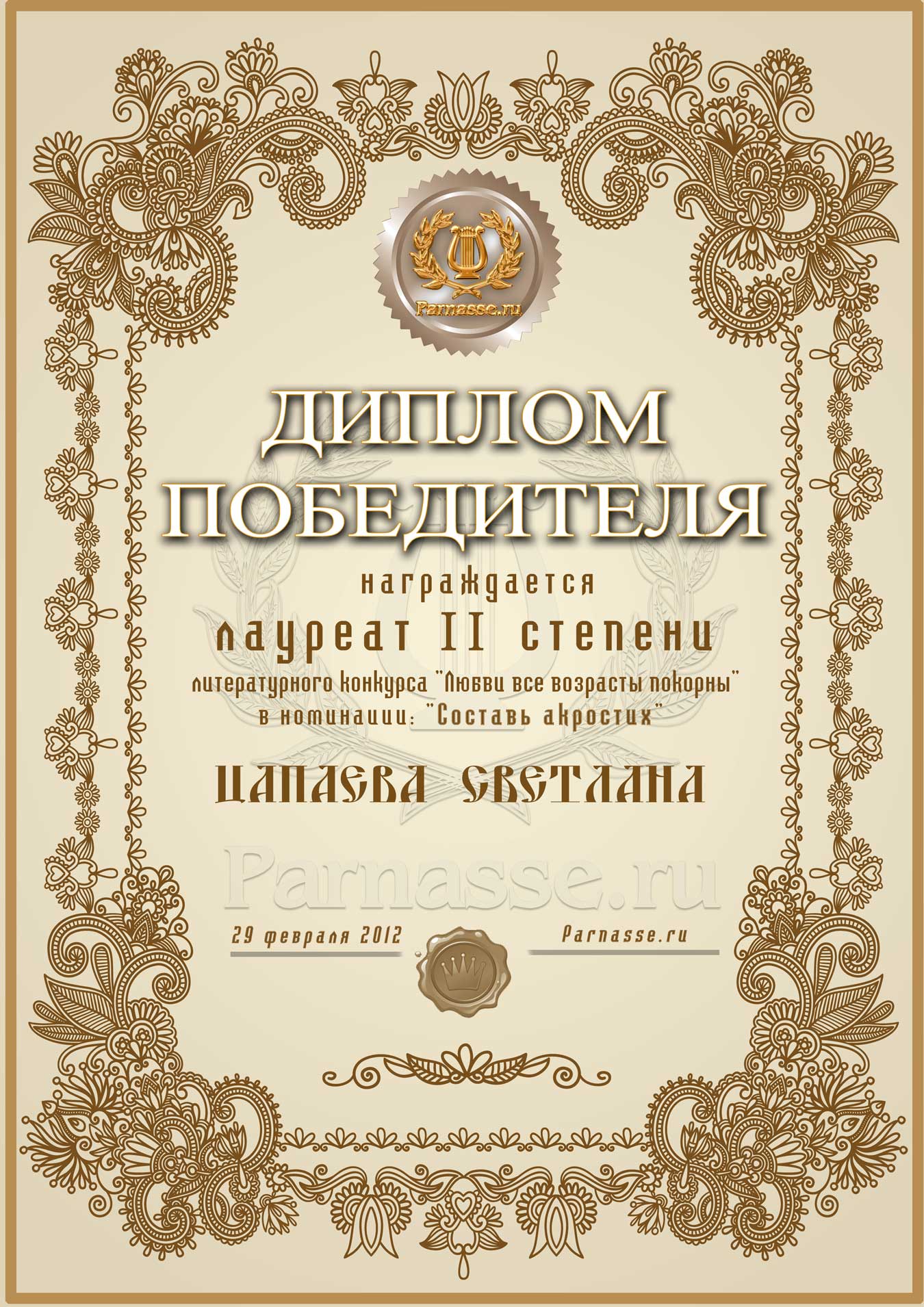 Диплом лауреата II степени сетевого лит. конкурса "Любви все возрасты покорны" в номинации "Составь акростих", (Редакторское голосование).