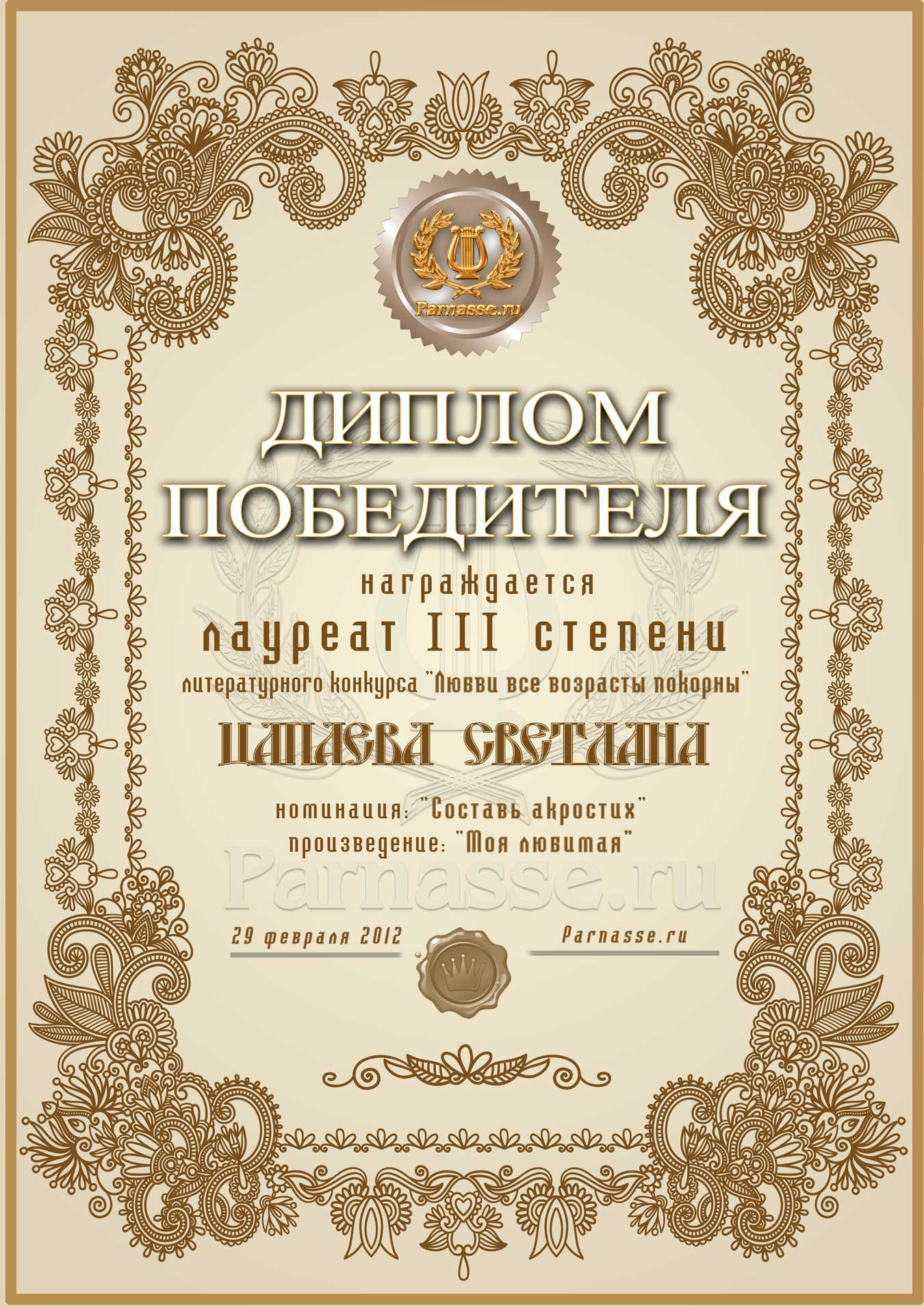 Диплом лауреата III степени лит.конкурса "Любви все возрасты покорны"
