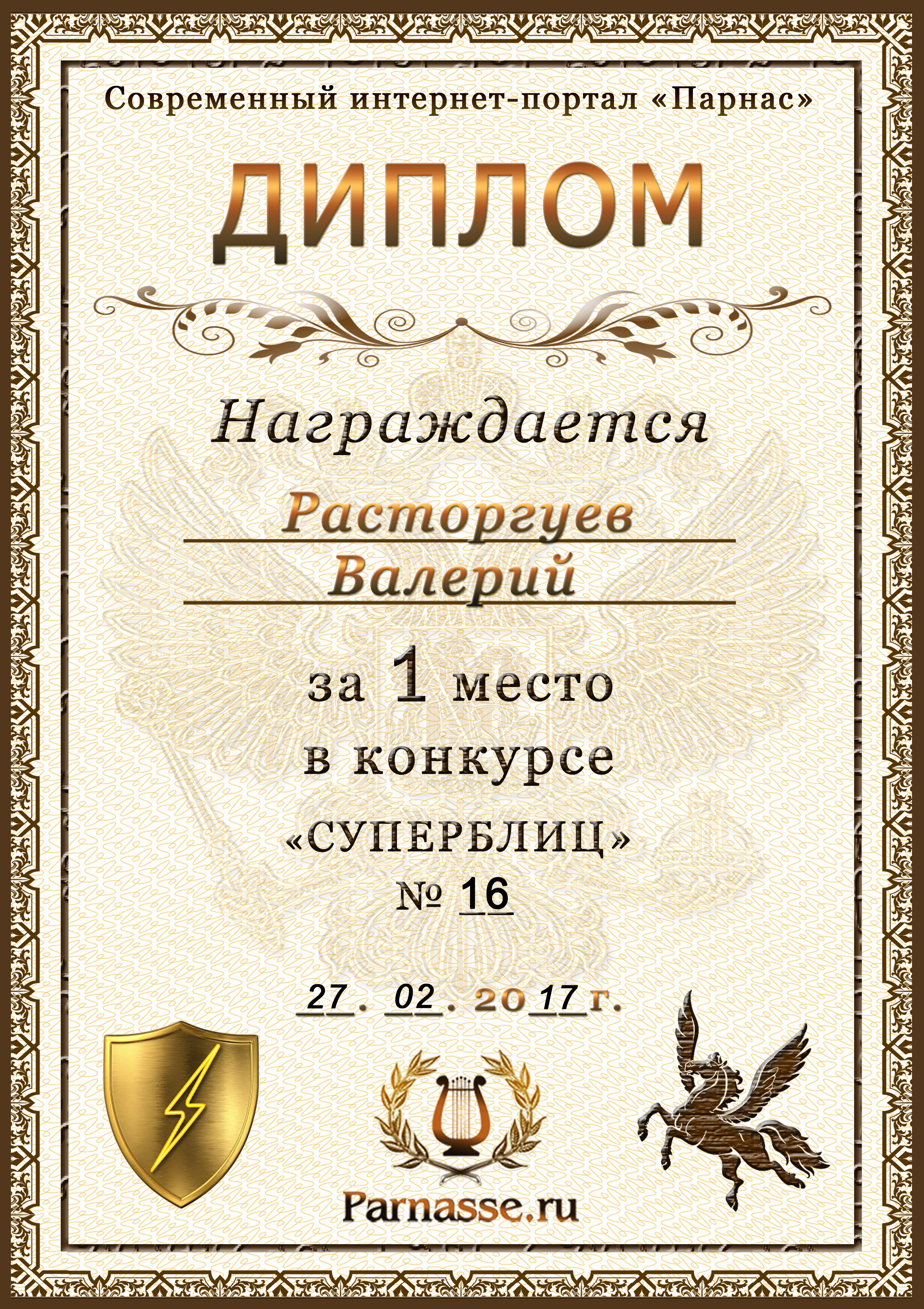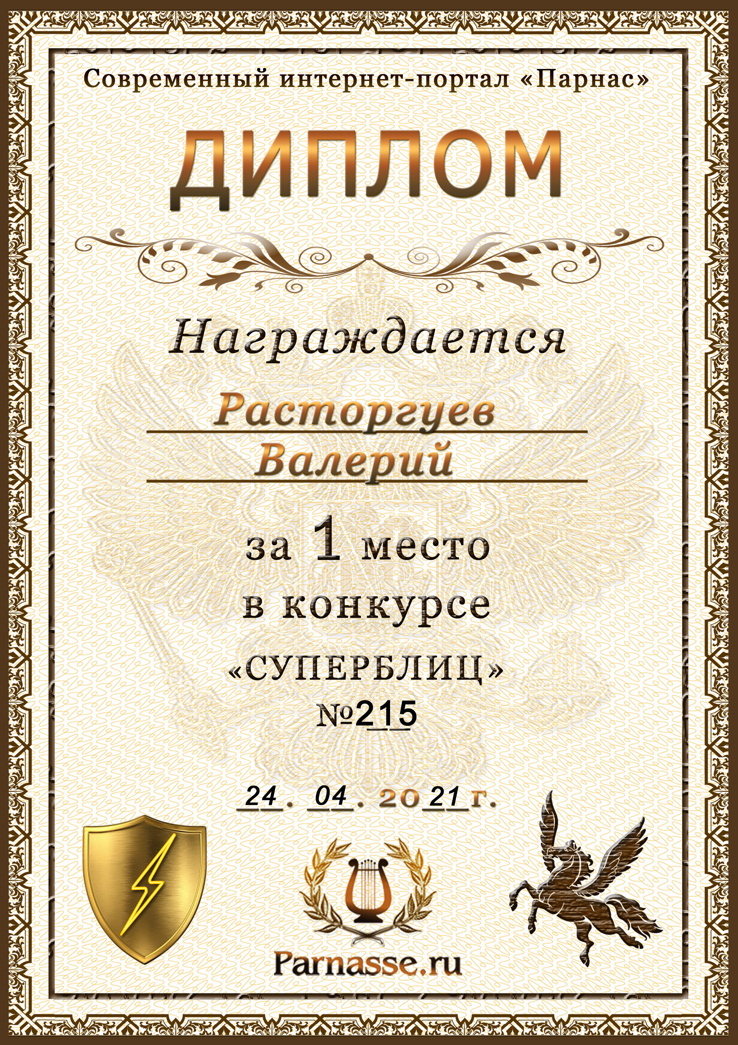 Диплом за 1 место в праздничном конкурсе "Поздравим Парнас с трёхлетием вместе!"