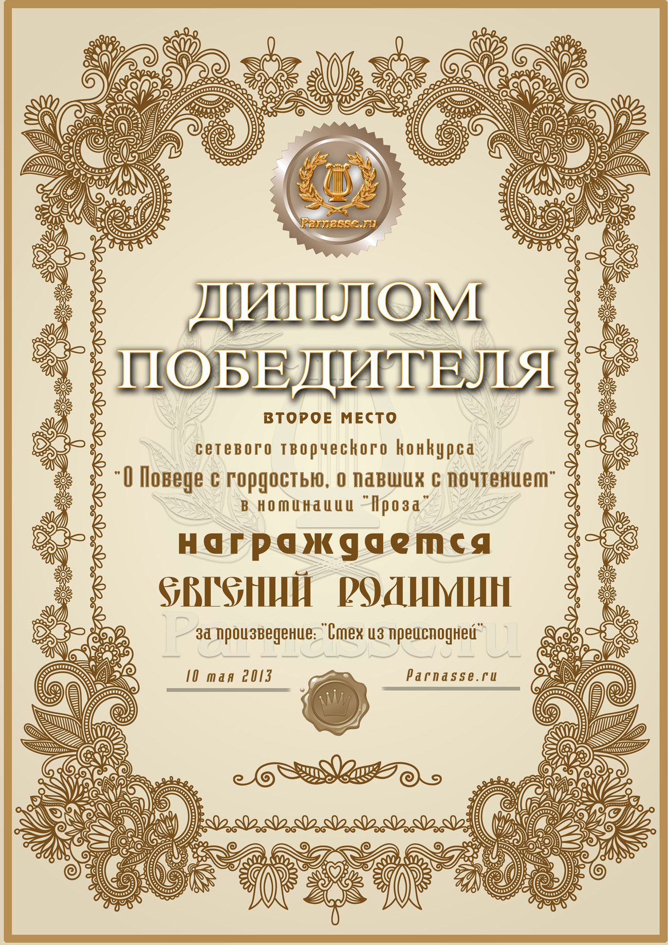 Второе место в музыкально-литературном конкурсе «О Победе с гордостью, о павших – с почтением!» Судейское голосование. Номинация в прозе «ВЕЛИКАЯ ОТЕЧЕСТВЕННАЯ ВОЙНА»! Произведение «СМЕХ ИЗ ПРЕИСПОДНЕЙ»! Поздравляем с заслуженной победой!