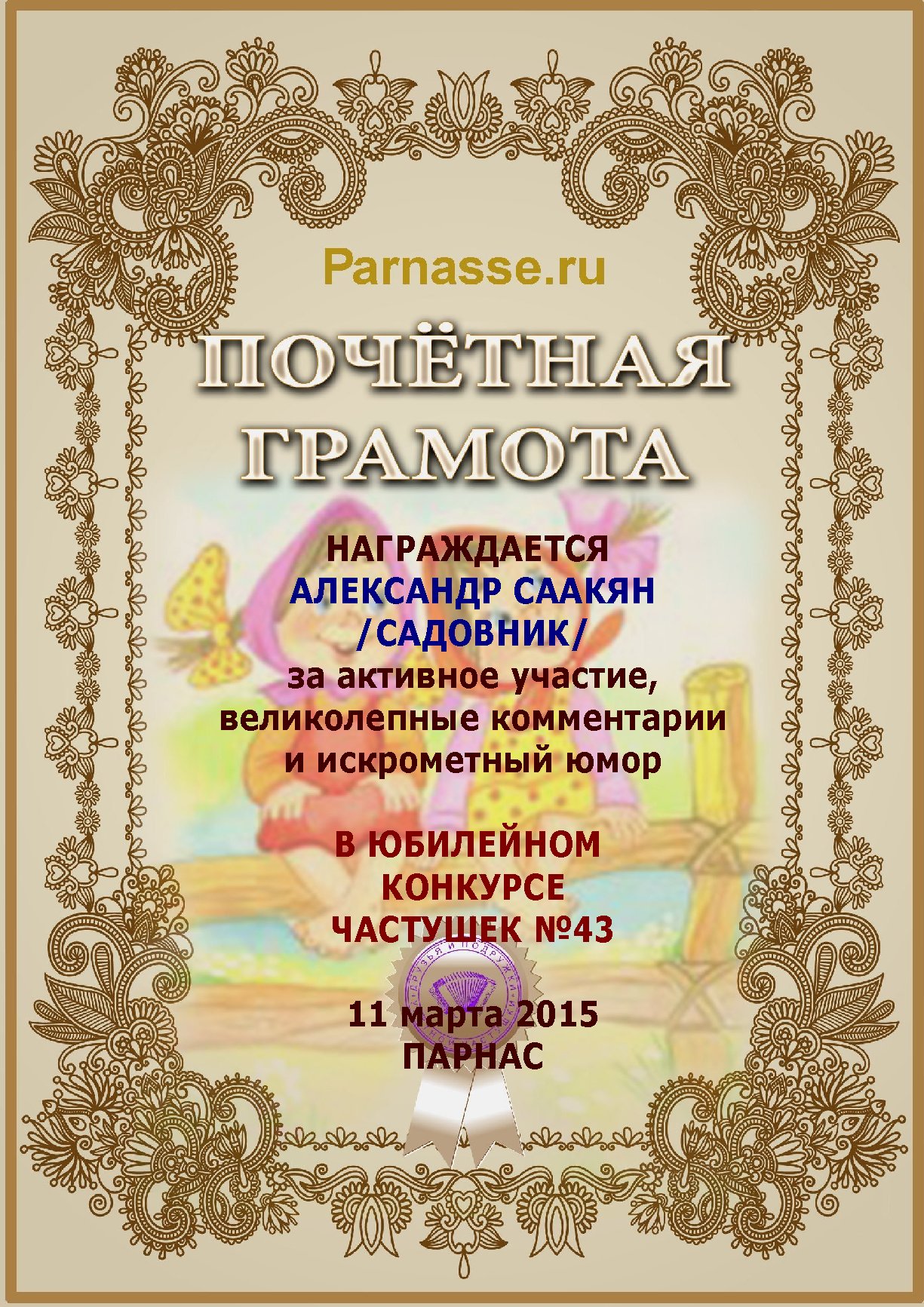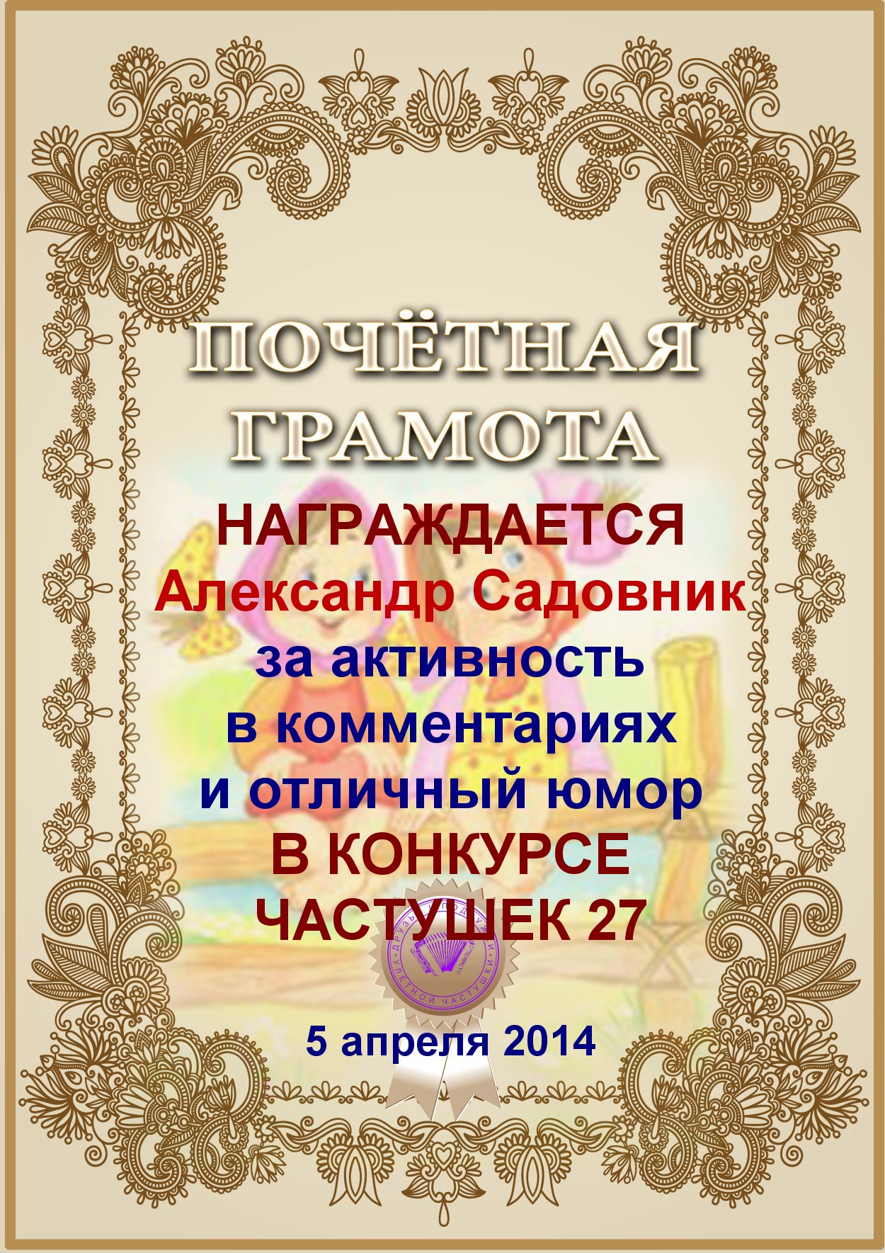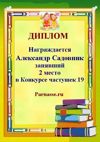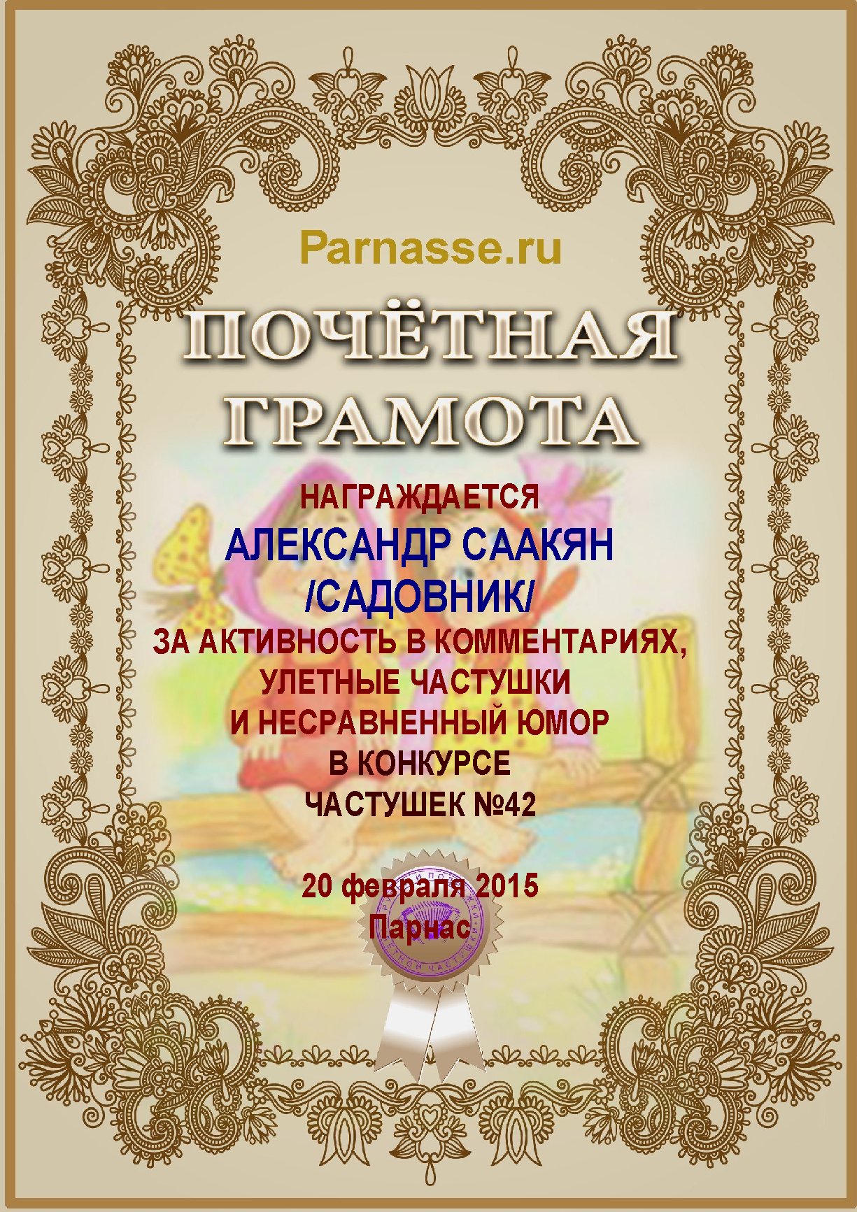 Грамота за активное участие и отличный юмор в комментариях к конкурсу частушек №35
