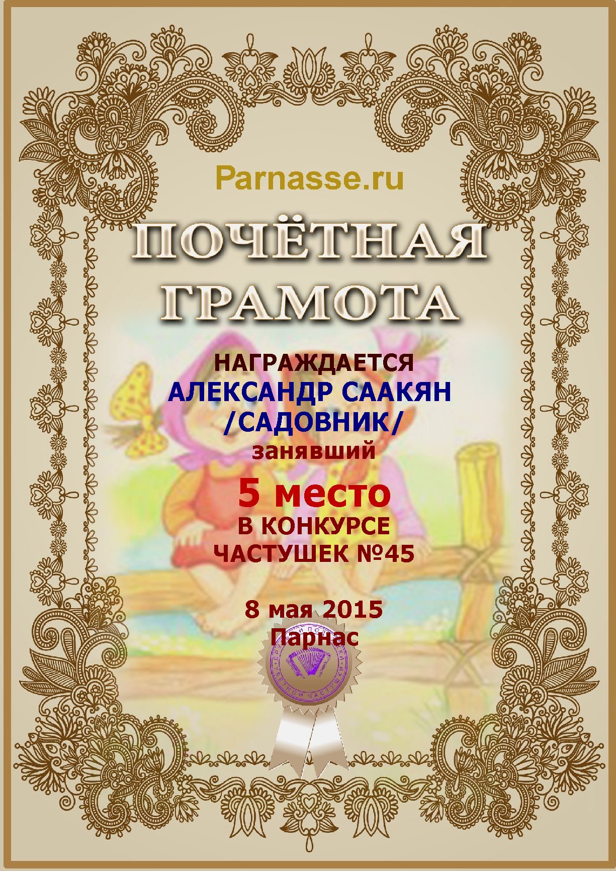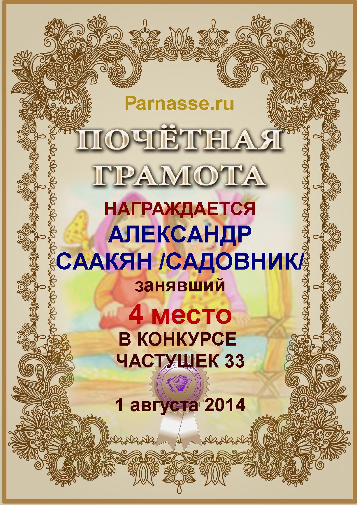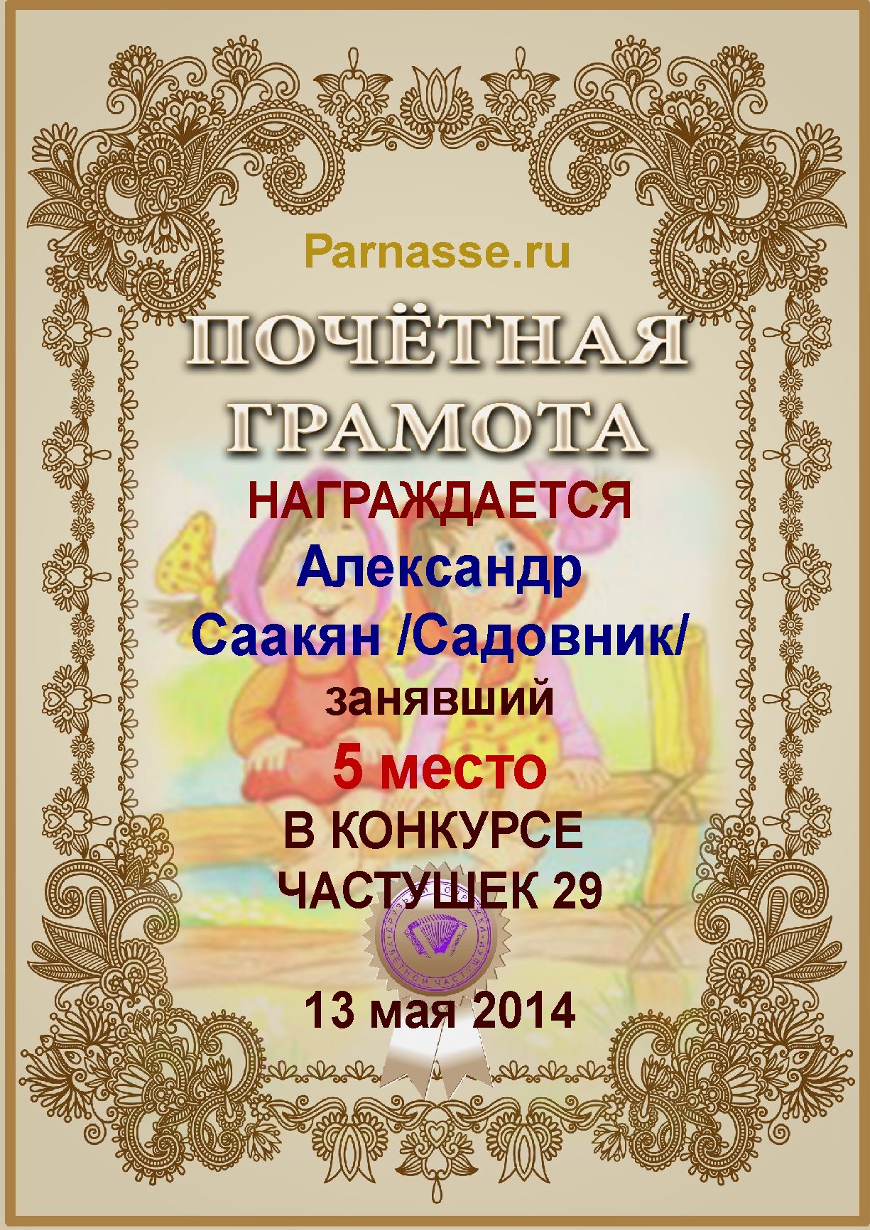 Грамота за активное участие и отличный юмор в комментариях к конкурсу частушек №35