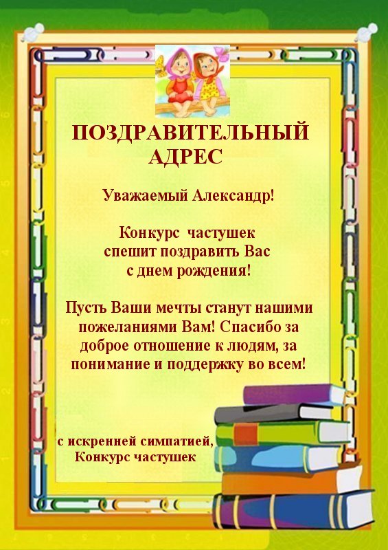 Уважаемый Александр! С Днём Рождения Вас! Пусть для Вас всегда погода будет солнечной, вершины по плечу, а рыбка золотой! Счастья, радости, благополучия и бесконечного вдохновения! Всего самого солнечного и радостного! Всех самых больших благ!