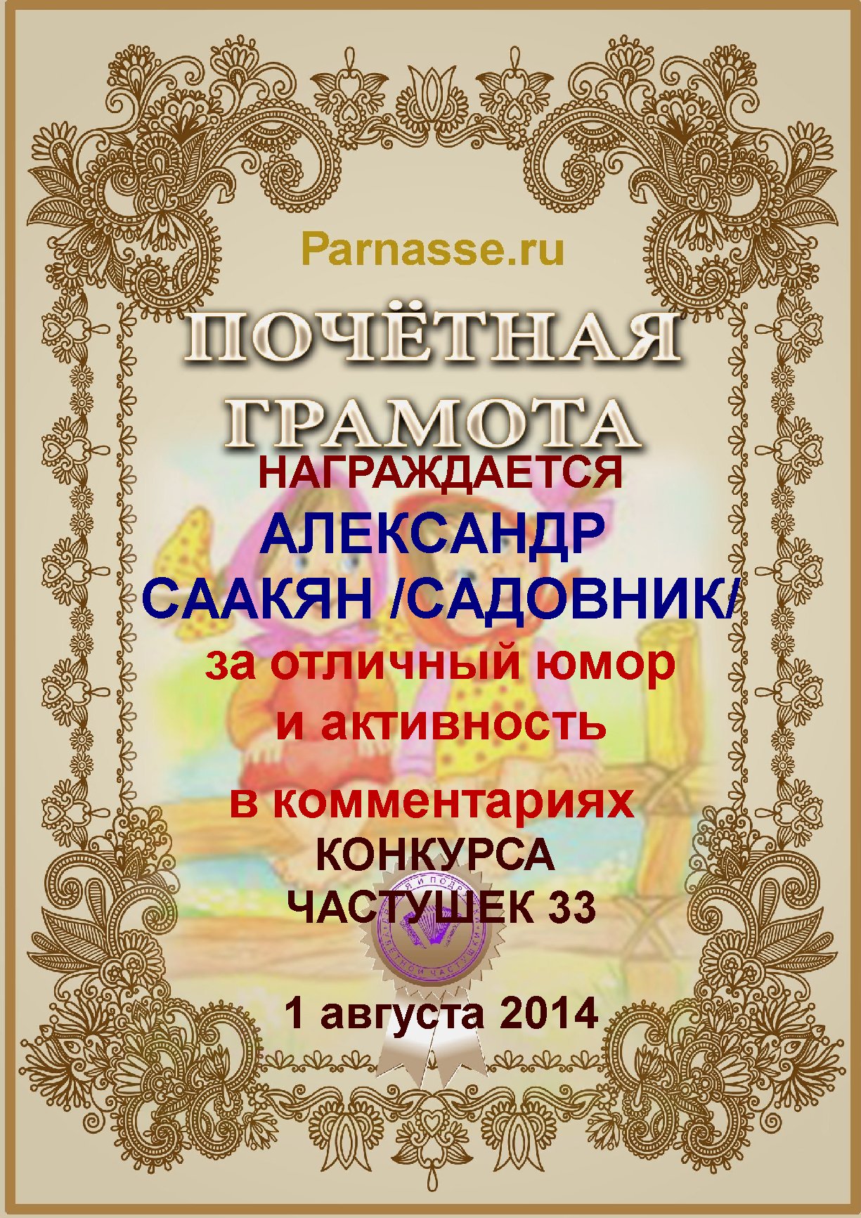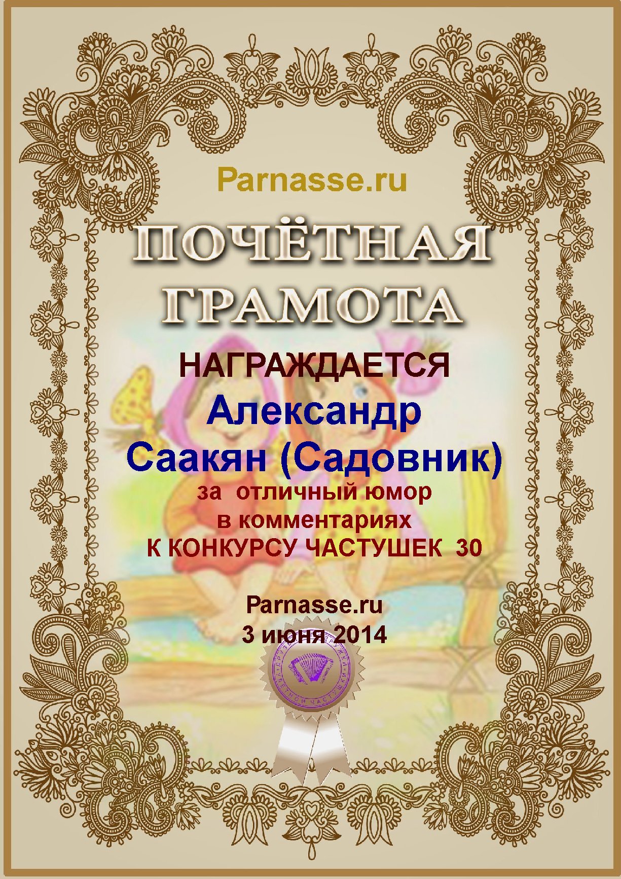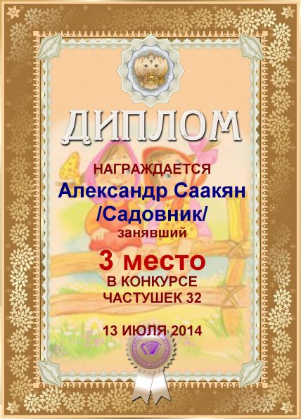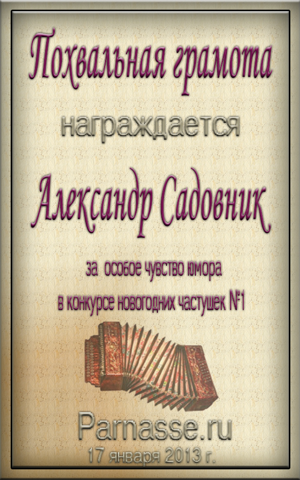 Грамота за активное участие и отличный юмор в комментариях к конкурсу частушек №34