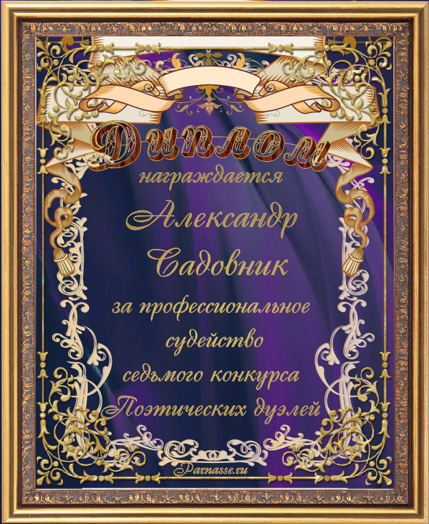 ДИПЛОМ ЗА ПРОФЕССИОНАЛЬНОЕ СУДЕЙСТВО В СЕДЬМОМ КОНКУРСЕ ПОЭТИЧЕСКИХ ДУЭЛЕЙ