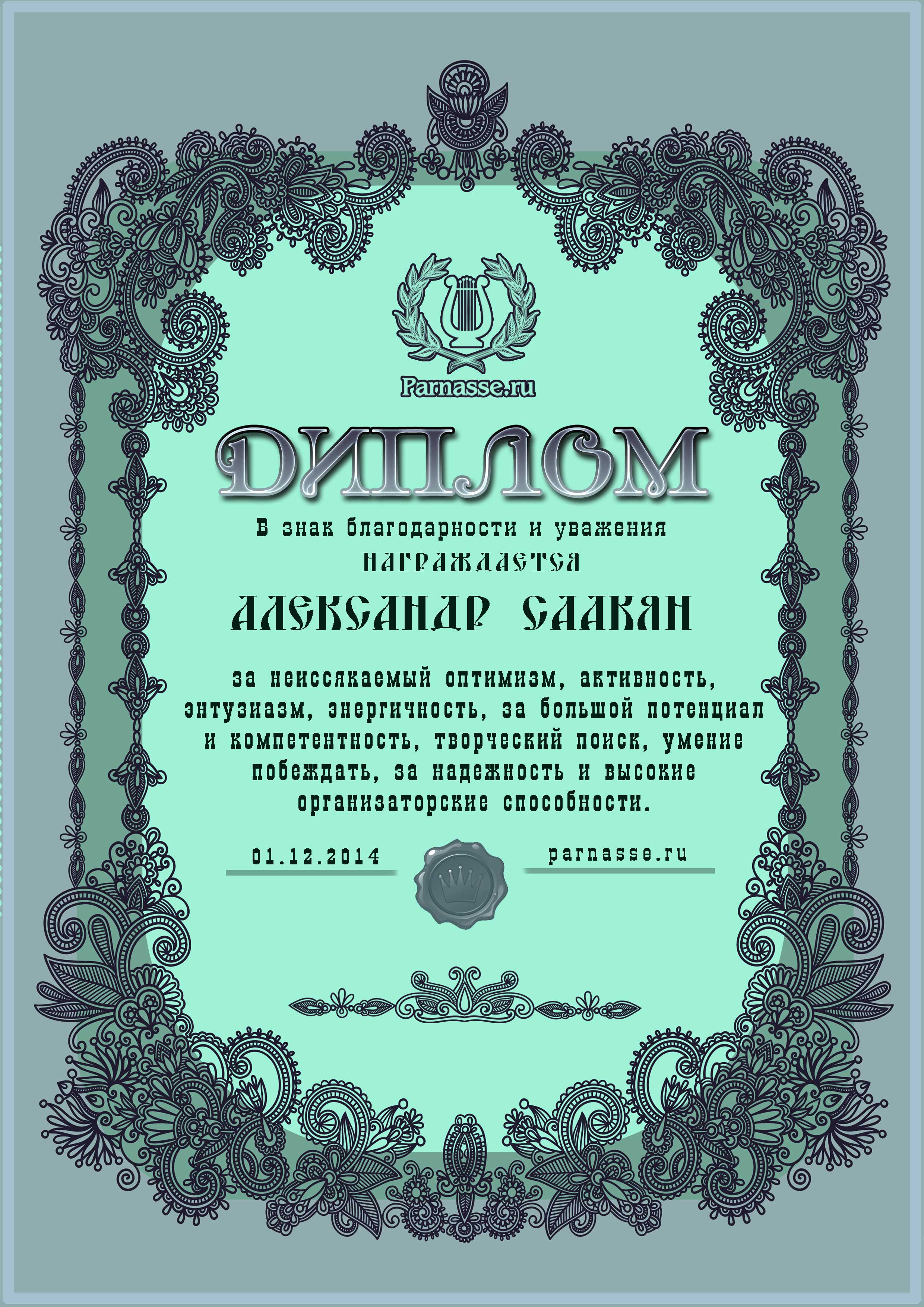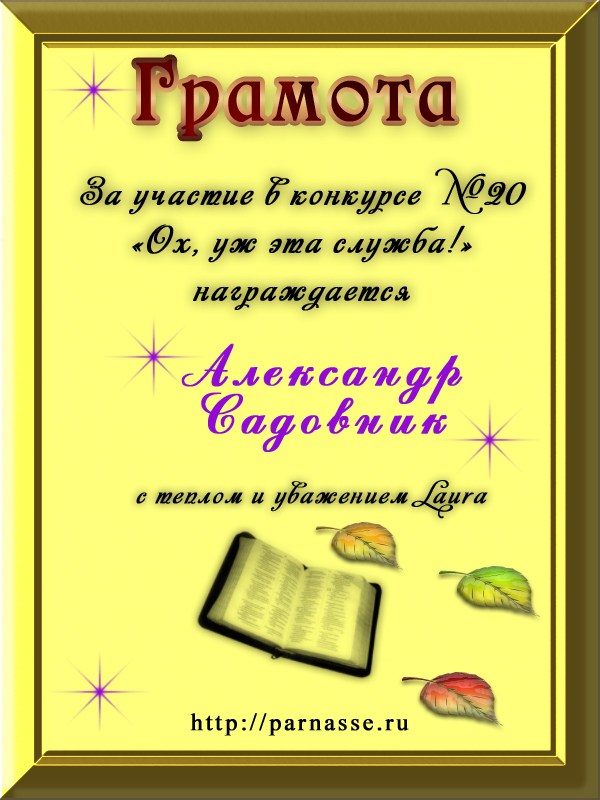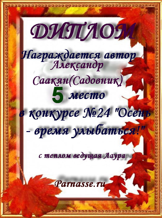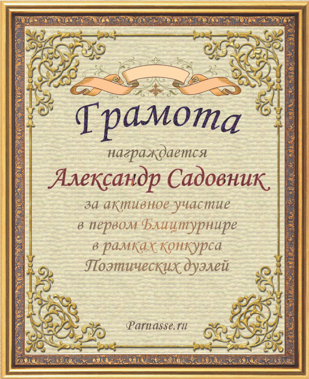 За неугасающую и неисчерпаемую творческую активность, постоянный контакт с Музой и признание сообществом "Парнасцев".От всей души желаем Вам, Александр, здоровья, любви, успехов, благополучия, удачи и творческого вдохновения!