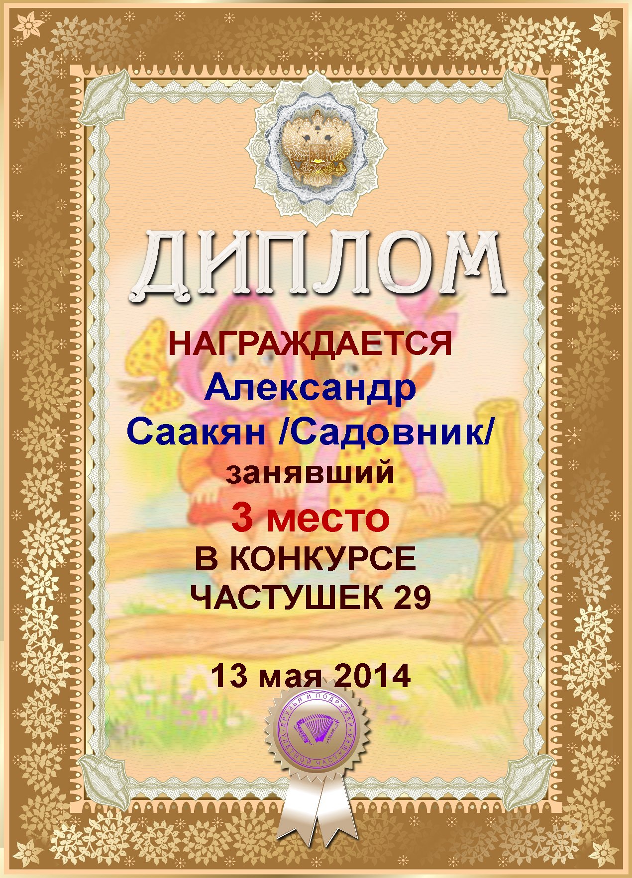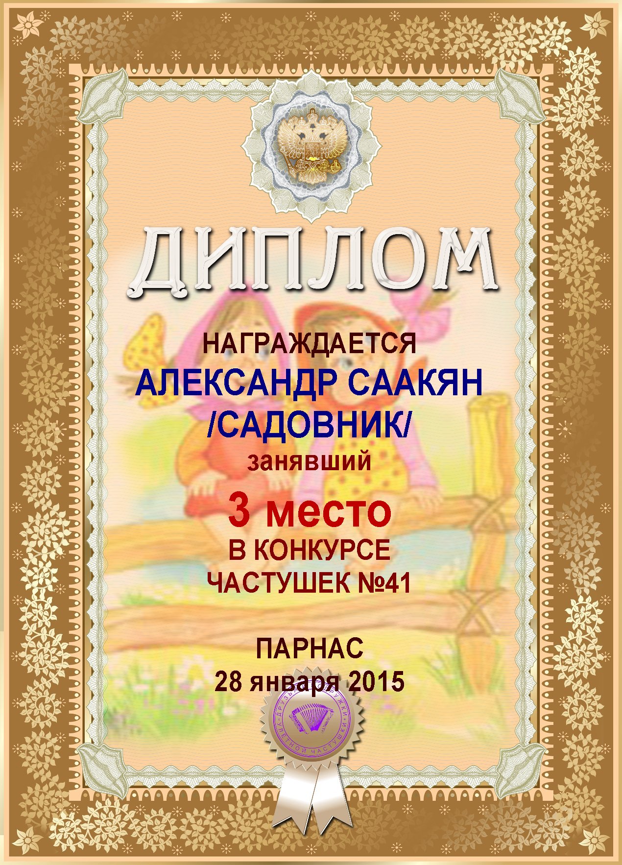 Диплом за 3 место в конкурсе частушек № 11
