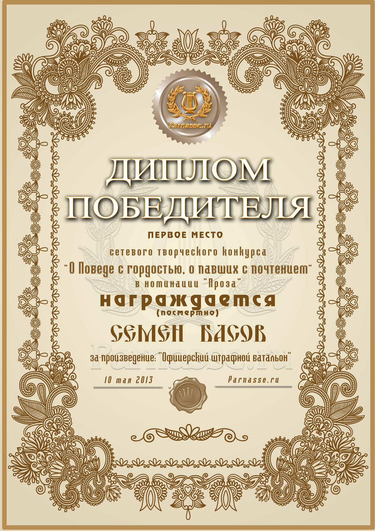 Первое место в музыкально-литературном конкурсе «О Победе с гордостью, о павших – с почтением!» Судейское голосование. Номинация в прозе «Солдаты Великой Победы»! Произведение «Офицерский штрафной батальон»! Поздравляем с заслуженной великолепной ПОБЕДОЙ!