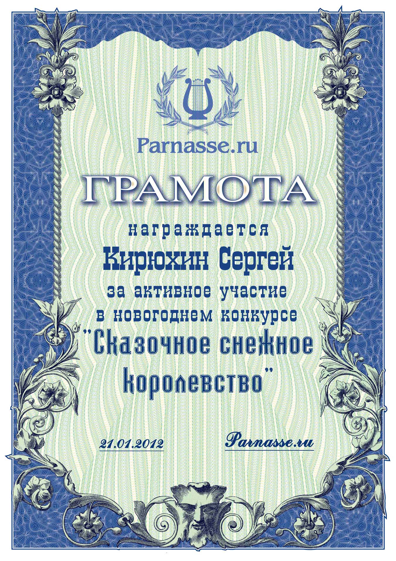 От лица Администрации творческого портала "Парнас" вручаем Вам этот памятный знак с самыми наилучшими пожеланиями! Пусть Вас весь год не покидает творческий запал, удача, а здоровье будет столь же крепким и нерушимым, как и традиция Новогоднего праздника! Счастья, успехов и любви Вам и Вашей семье, друзьям и близким!