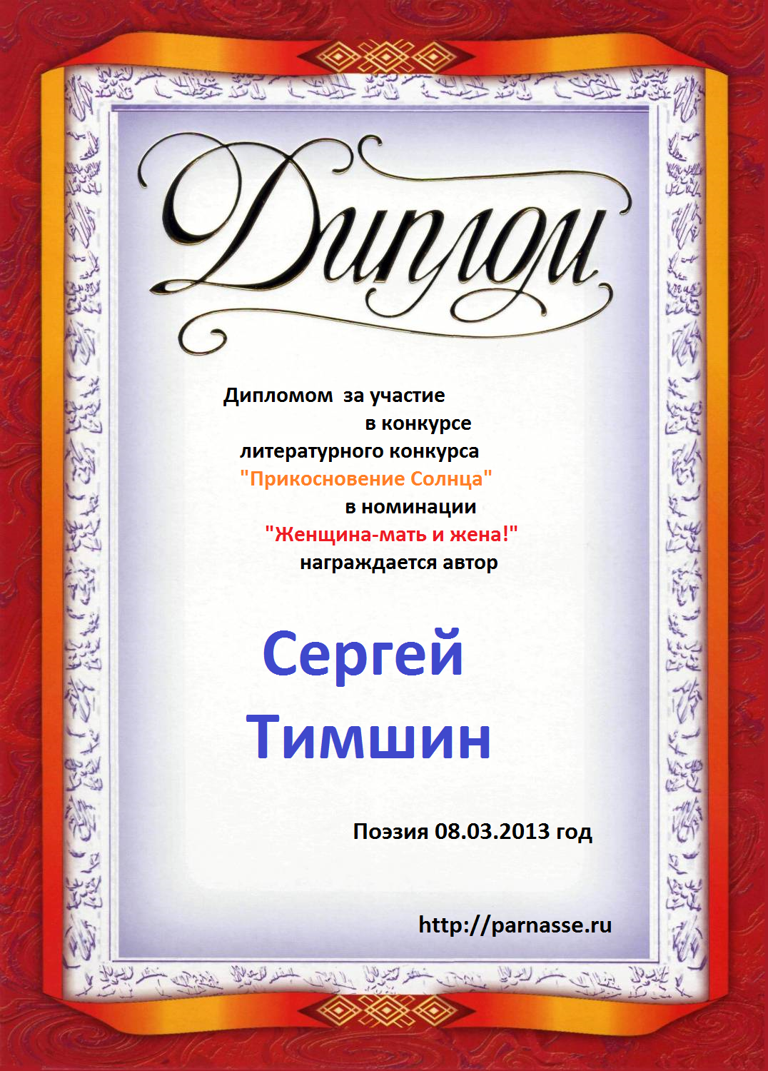 Диплом в конкурсе поэзии "Прикосновение Солнца"