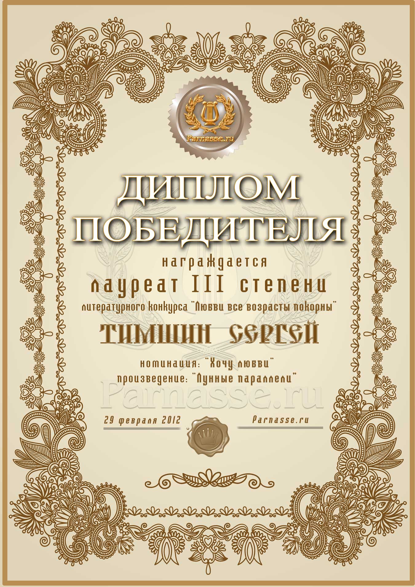 ![]() Лауреат III степени литературного конкурса «Любви все возрасты покорны»!