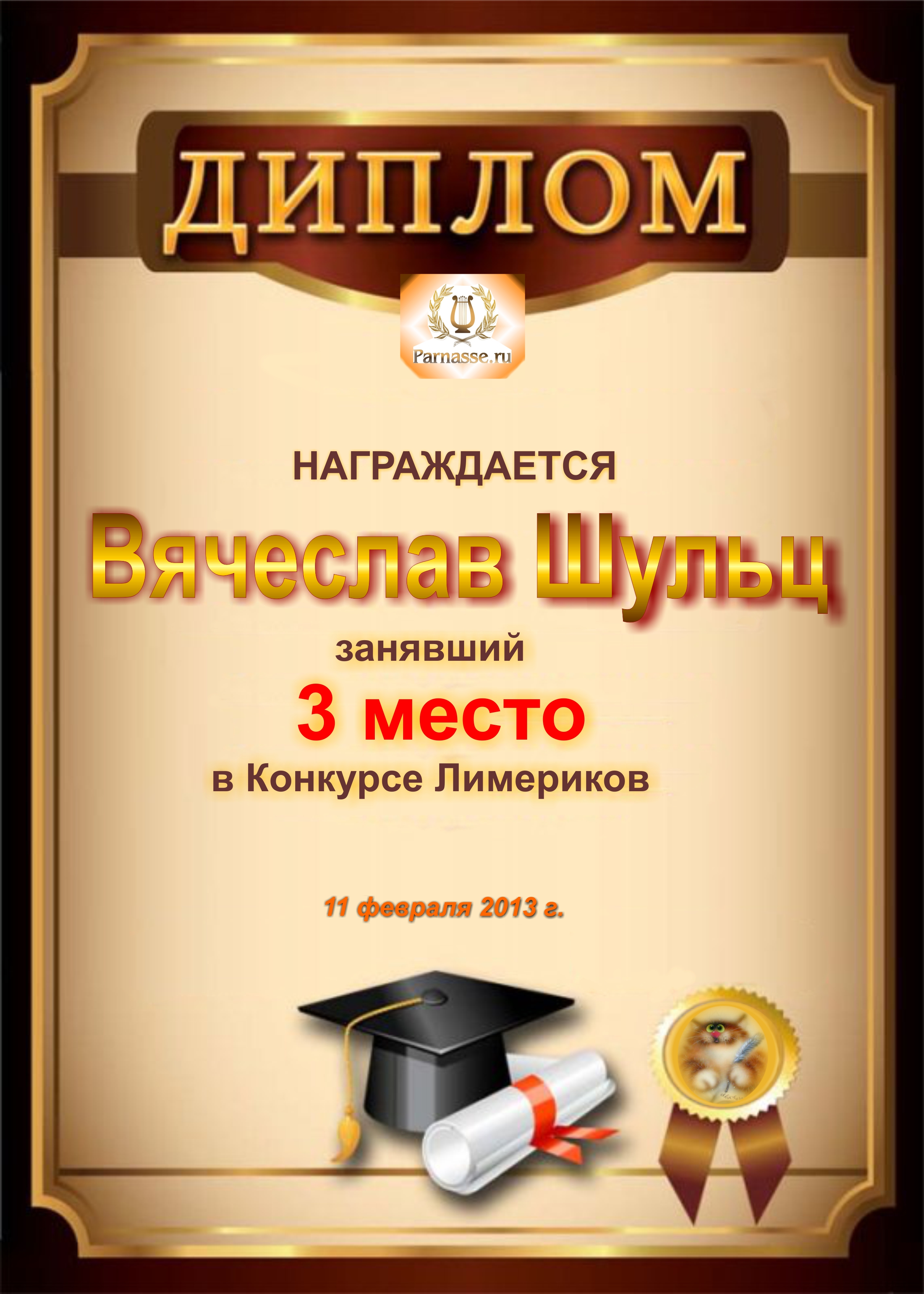 Диплом за 1 место в праздничном конкурсе "Поздравим Парнас с трёхлетием вместе!"