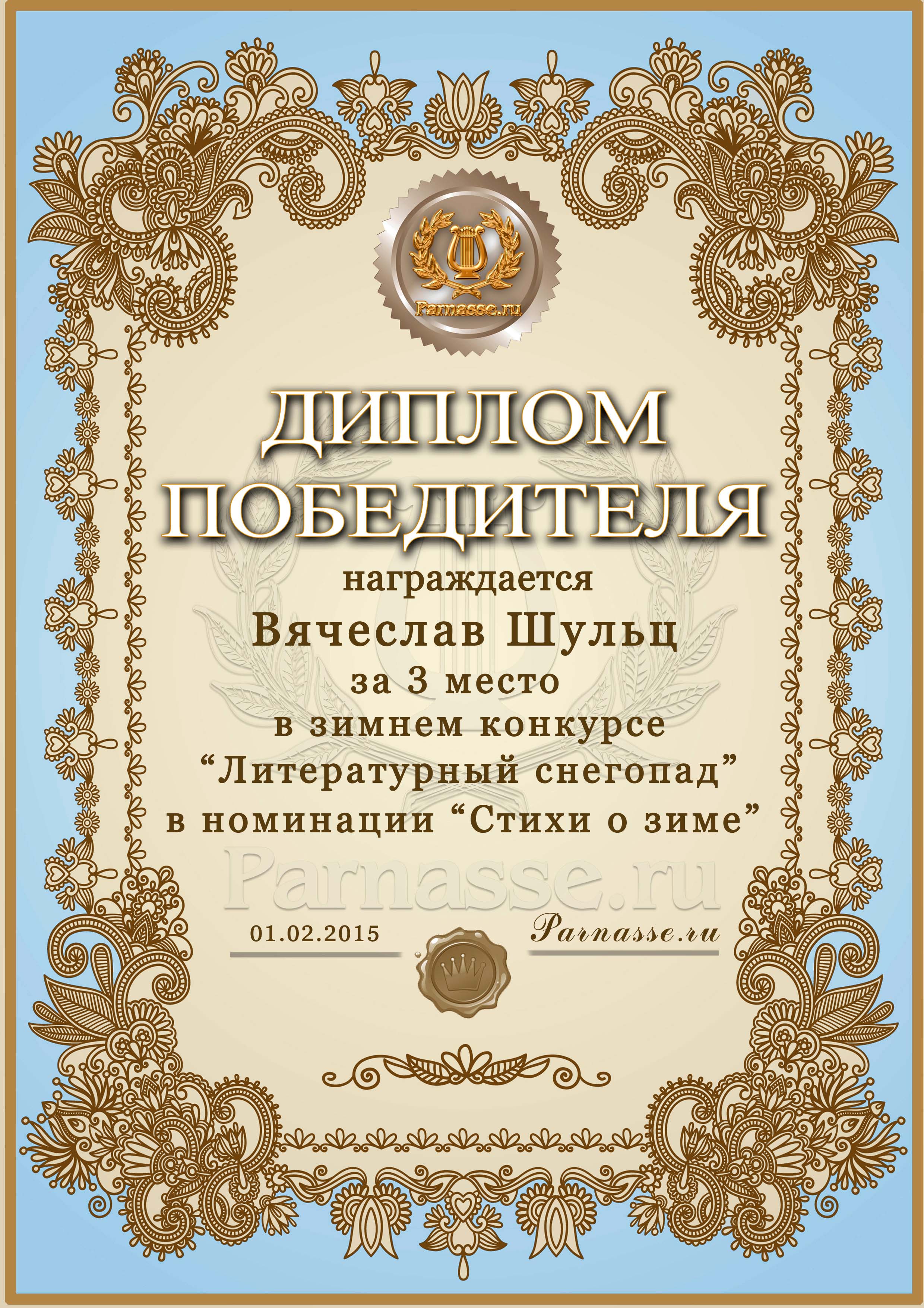Диплом за 3 место в конкурсе "Литературный снегопад".