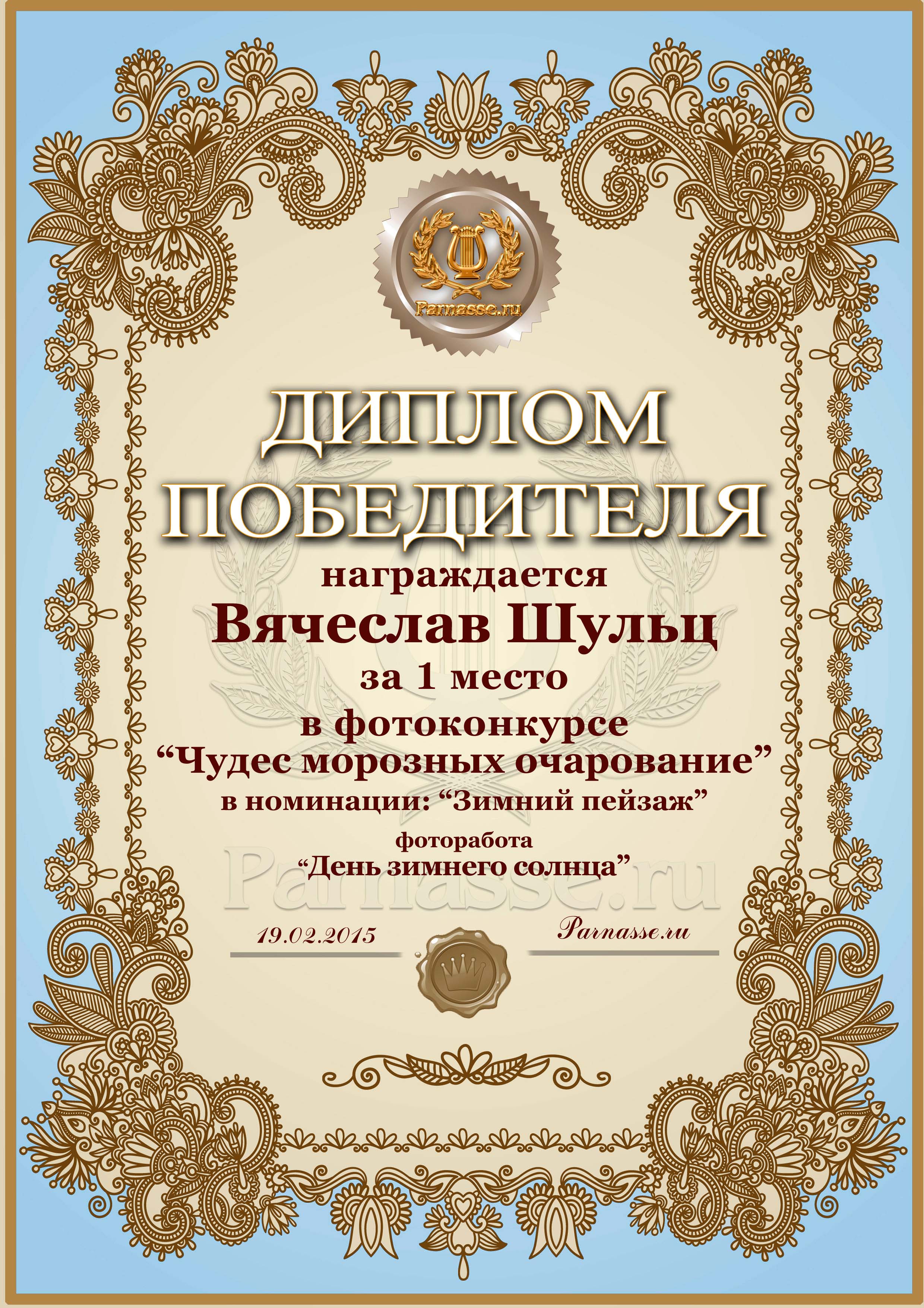 Диплом за 1 место в фотоконкурсе "Чудес морозных очарование"