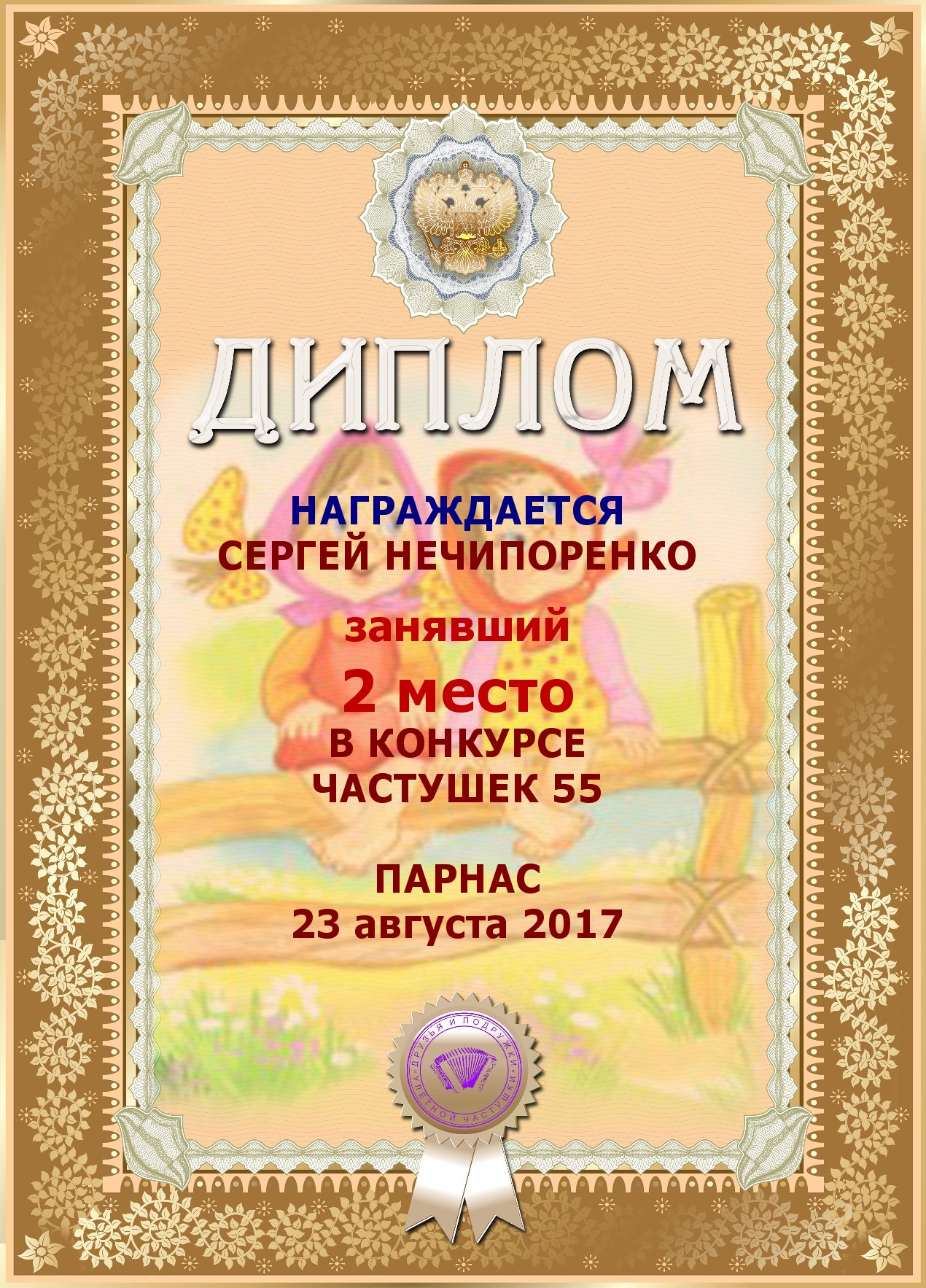 Диплом за 2е место в конкурсе частушек 55