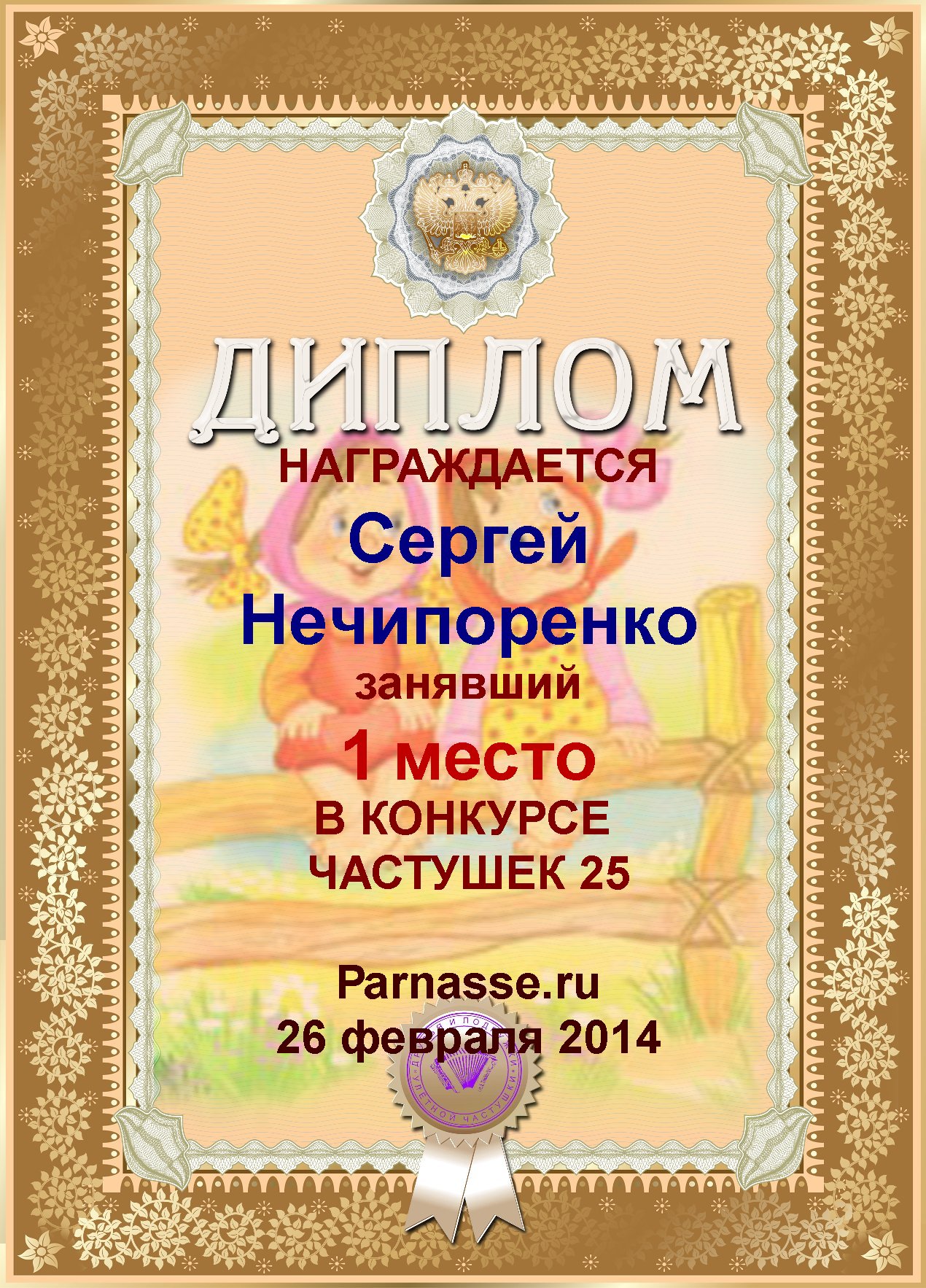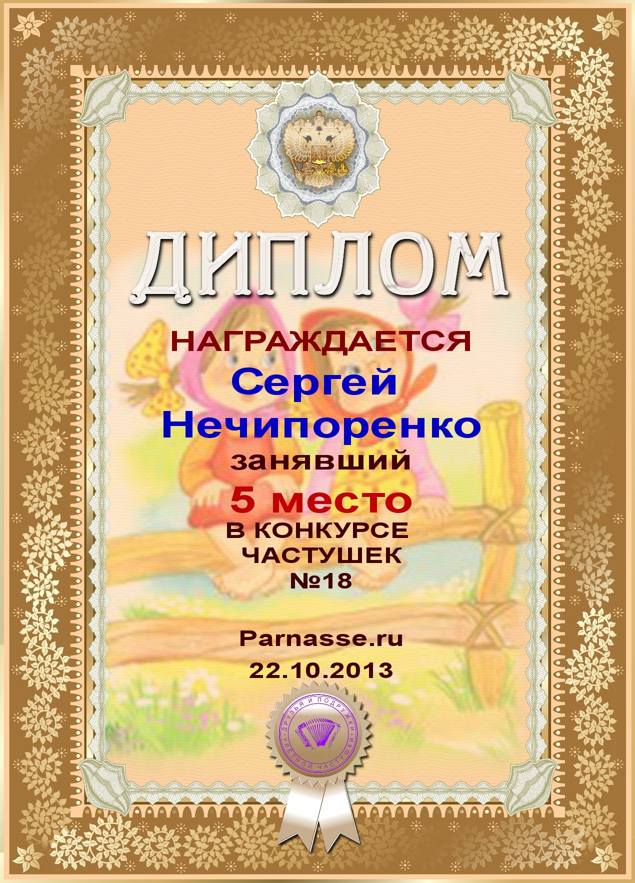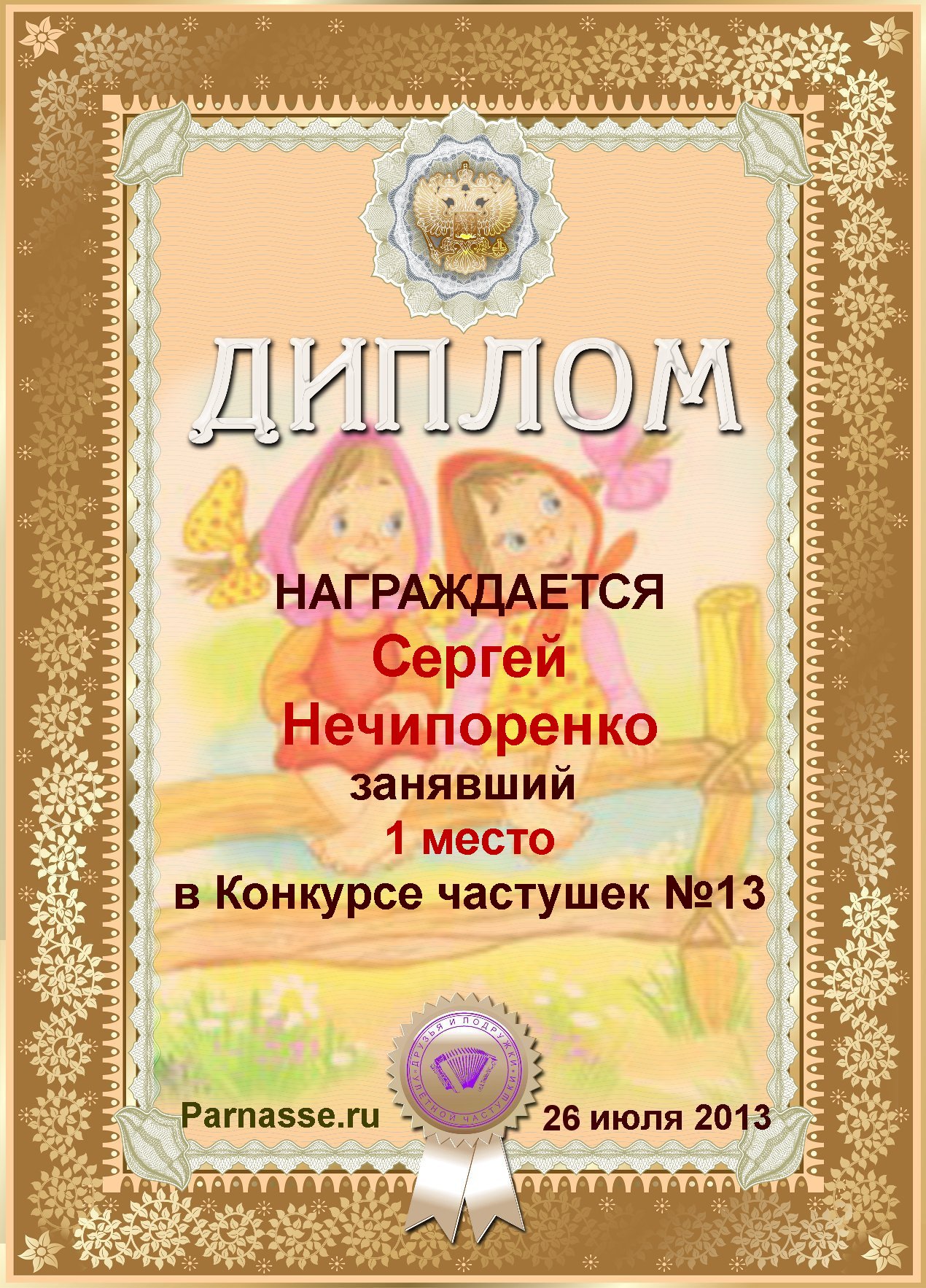 Диплом за 1е место в конкурсе частушек 19+