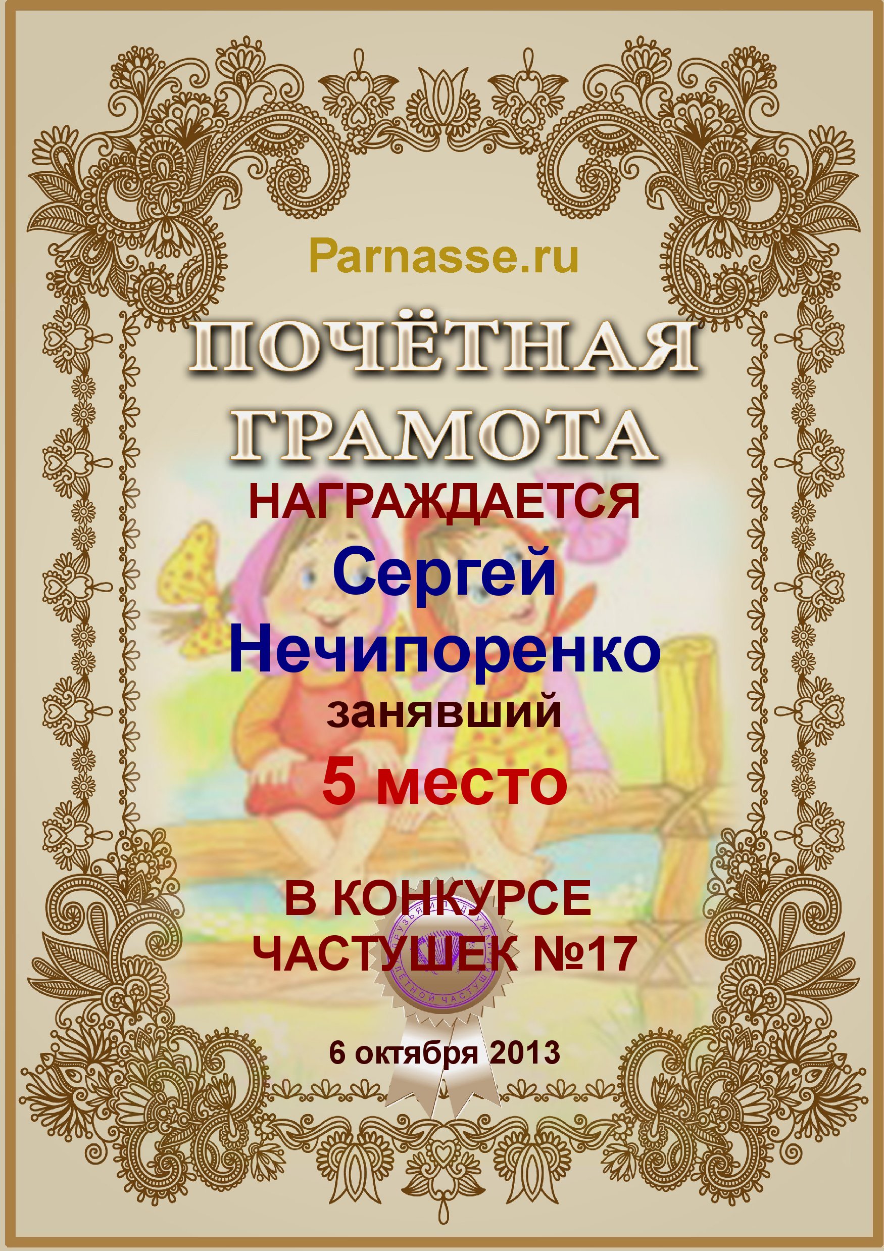 Почетная грамота за 5 место в конкурсе частушек №17