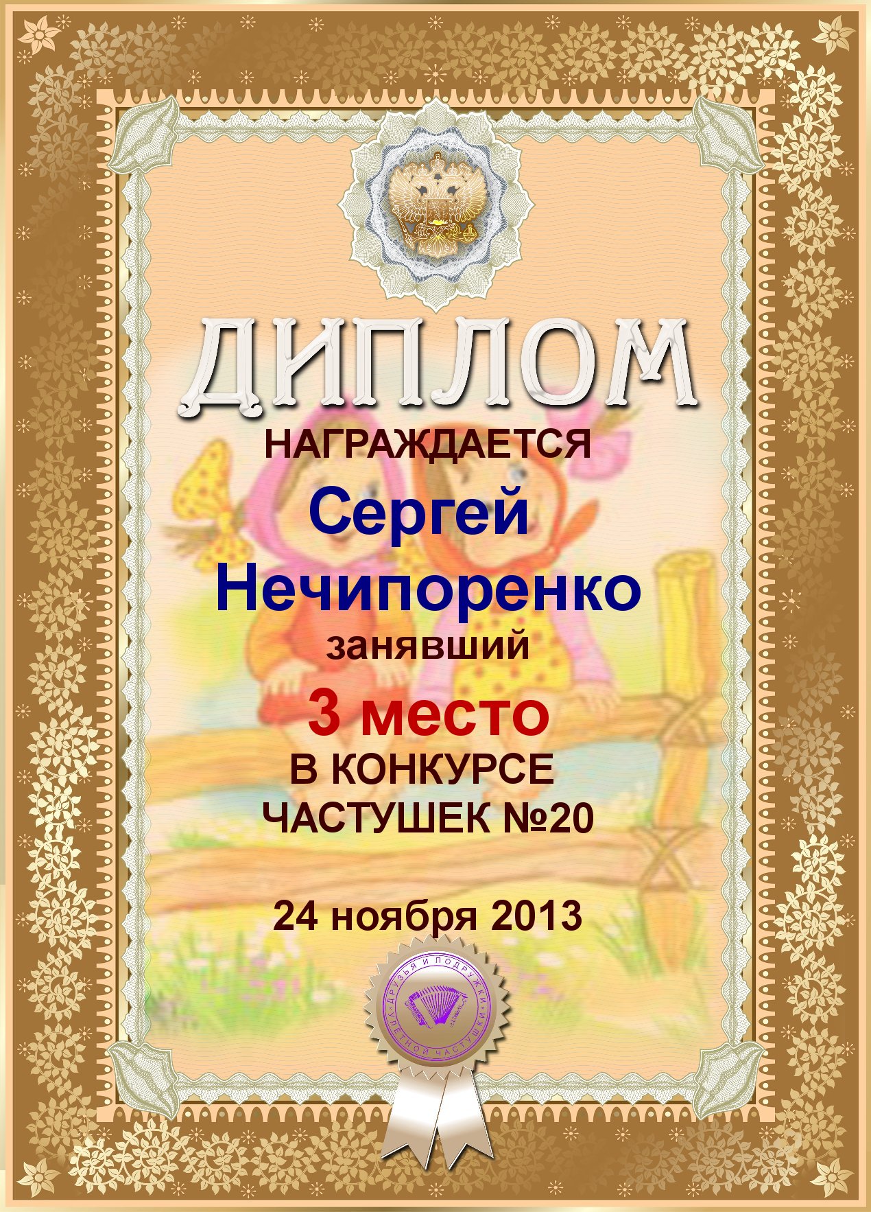 Диплом за 3е место в конкурсе частушек №20