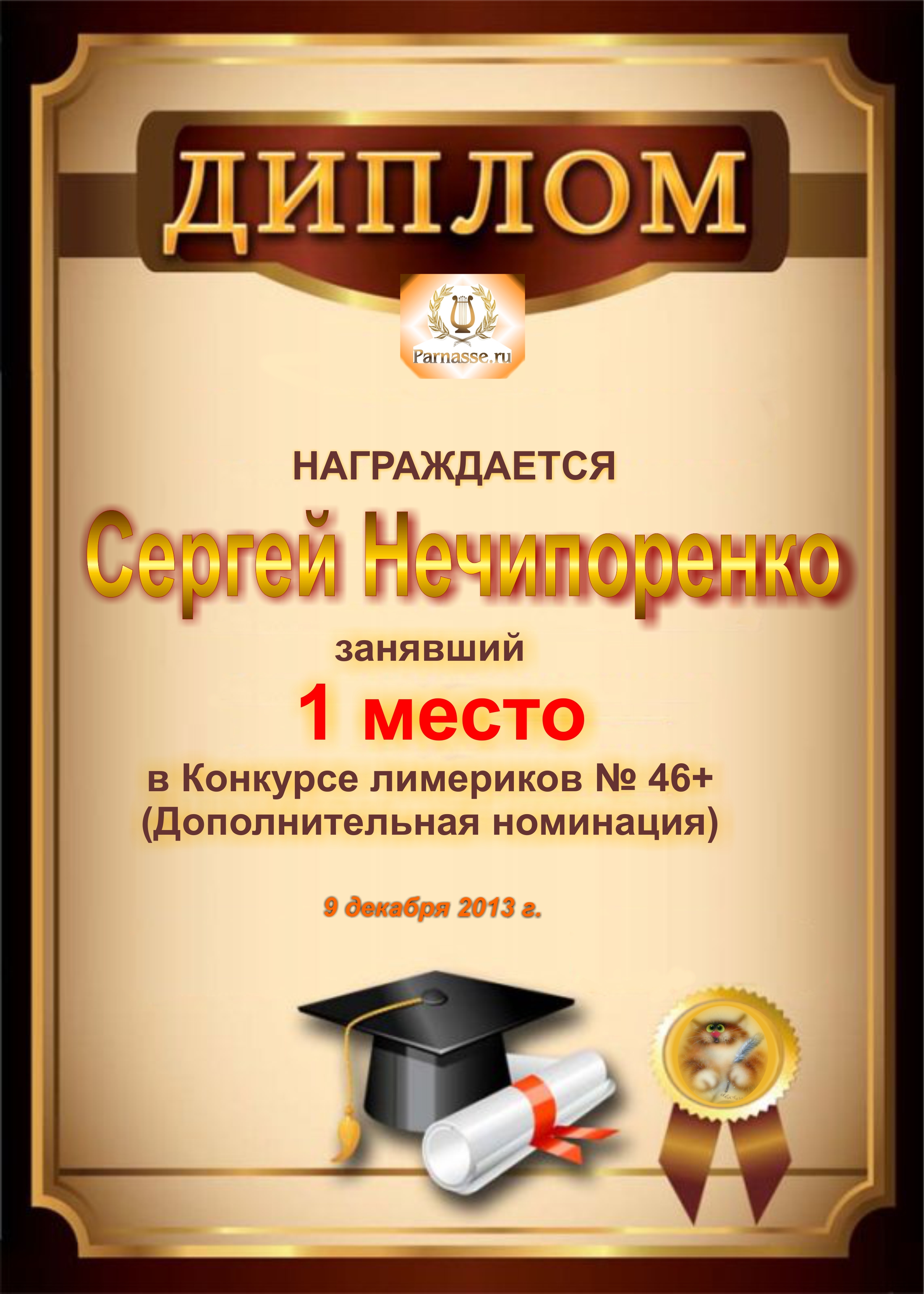 Диплом за победу и 1 место в дополнительной номинации конкурса лимериков № 46+ (9.12.2013 г.)