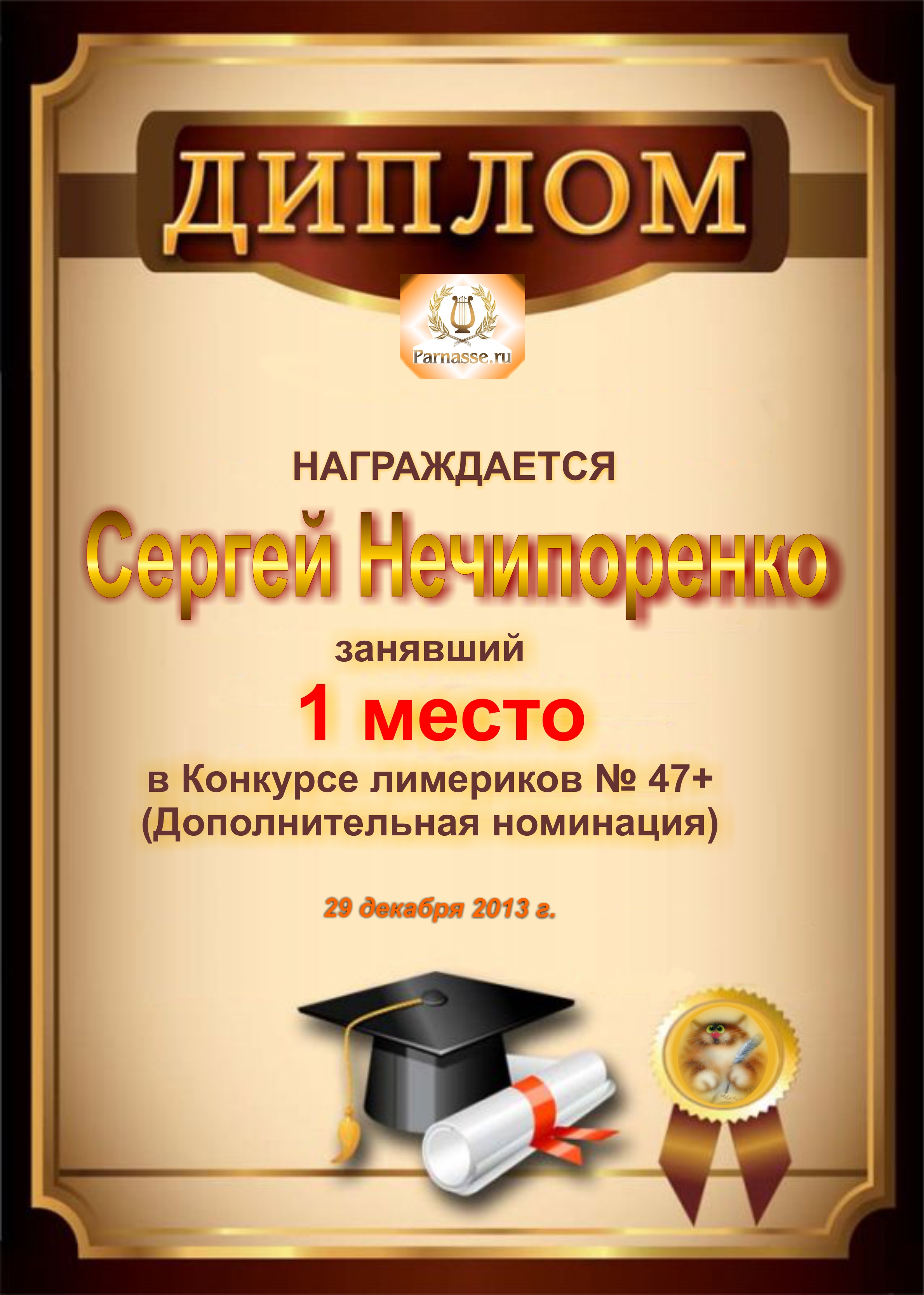 Диплом за победу и 1 место в дополнительной номинации конкурса лимериков № 47+ (29.12.2013 г.)