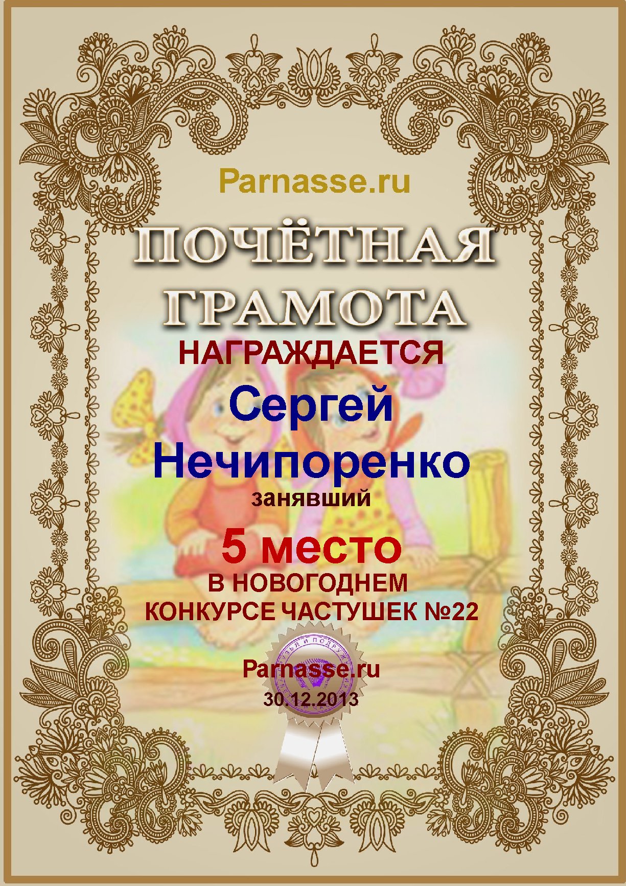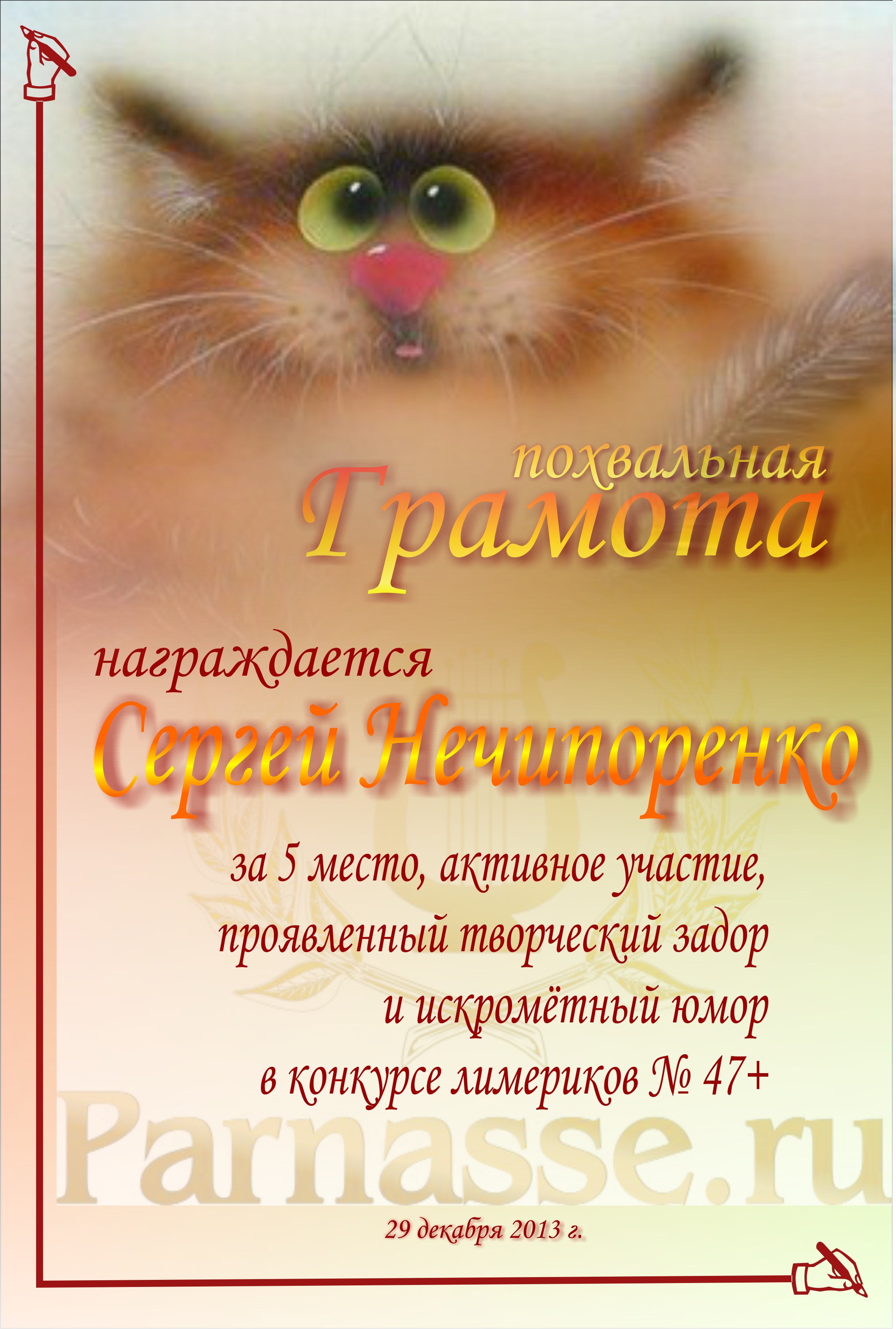Похвальная грамота за 5 место и активное участие в конкурсе лимериков № 47+ (29.12.2013 г.)
