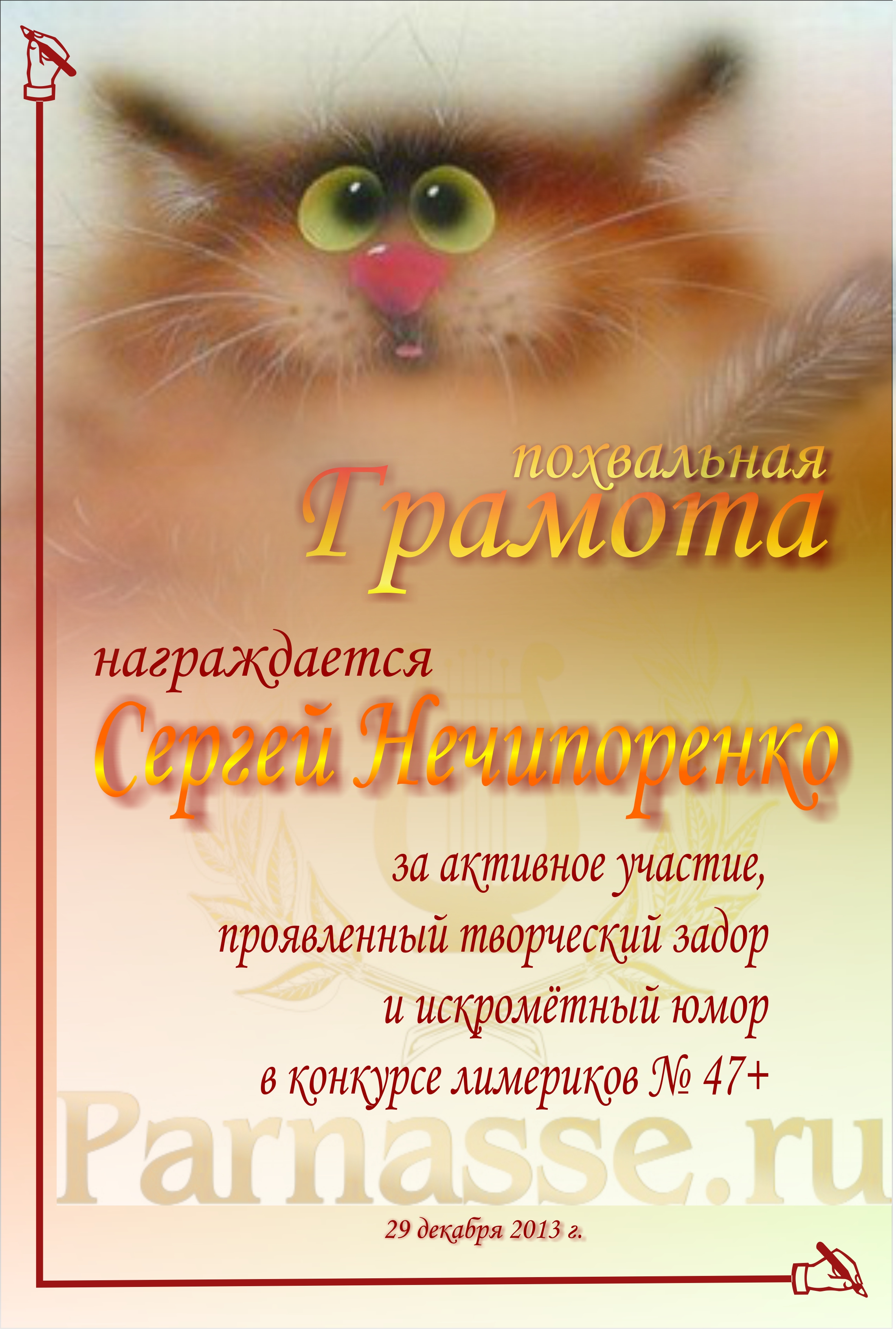 Похвальная грамота за активное участие в конкурсе лимериков № 47+ (29.12.2013 г.)