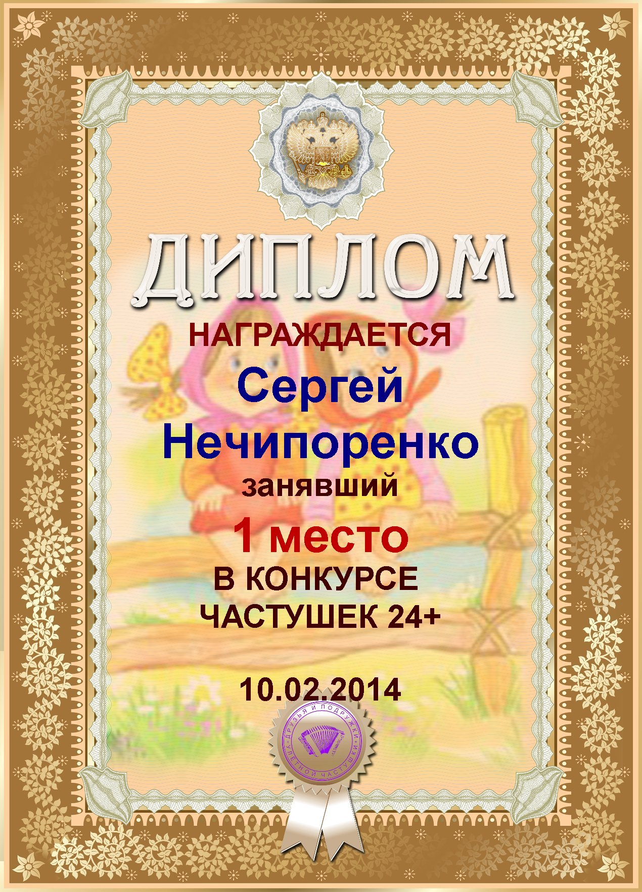 Диплом за 1е место в конкурсе частушек №24+