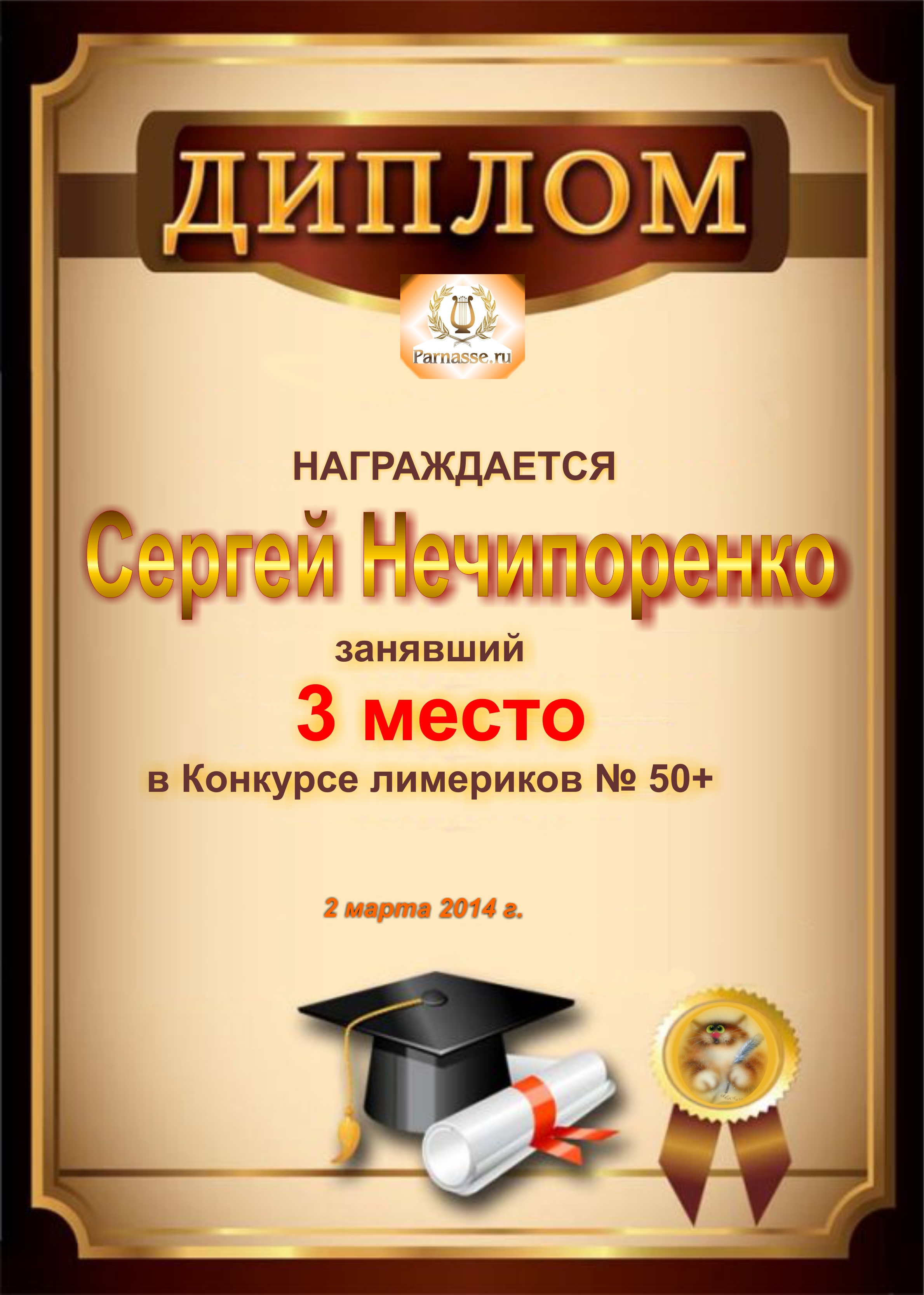 Диплом за победу и 3 место в конкурсе лимериков № 50+ (2.03.2014 г.)
